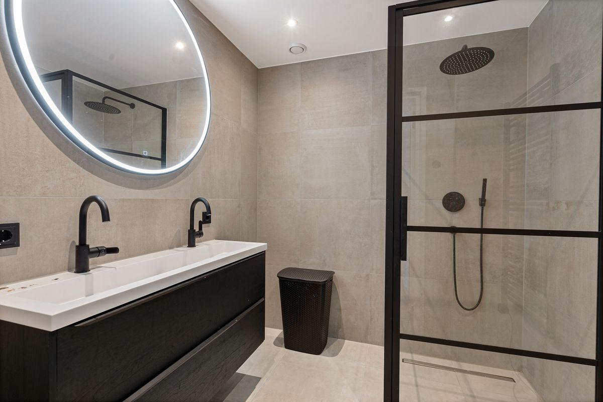 Ruime overloop met trap naar de tweede verdieping en separaat toilet. Aan de voorzijde een ruime slaapkamer, aan de achterzijde een riante tweede slaapkamer. Ook hier valt de hoogwaardige afwerking direct op. De luxe badkamer is uitgevoerd in moderne kleurstelling en beschikt over een dubbel wastafelmeubel, een ruime inloop/regendouche en dimbare plafondspots.