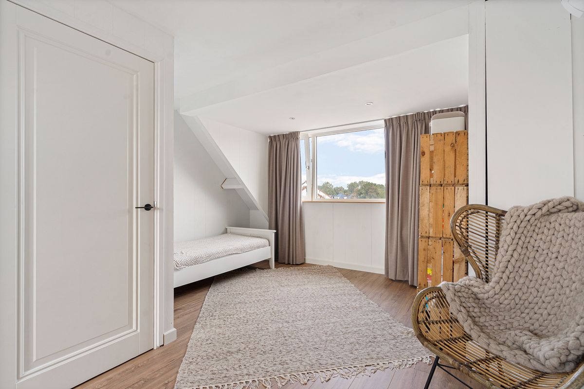 De overloop leidt naar een sfeervolle, zeer ruime 3e slaapkamer, voorzien van twee dakkapellen. Deze ruimte is ruim genoeg om, indien gewenst, eenvoudig twee kamers van te maken. Aangrenzend is er een praktische kastruimte met de opstelling voor wasmachine en droger.