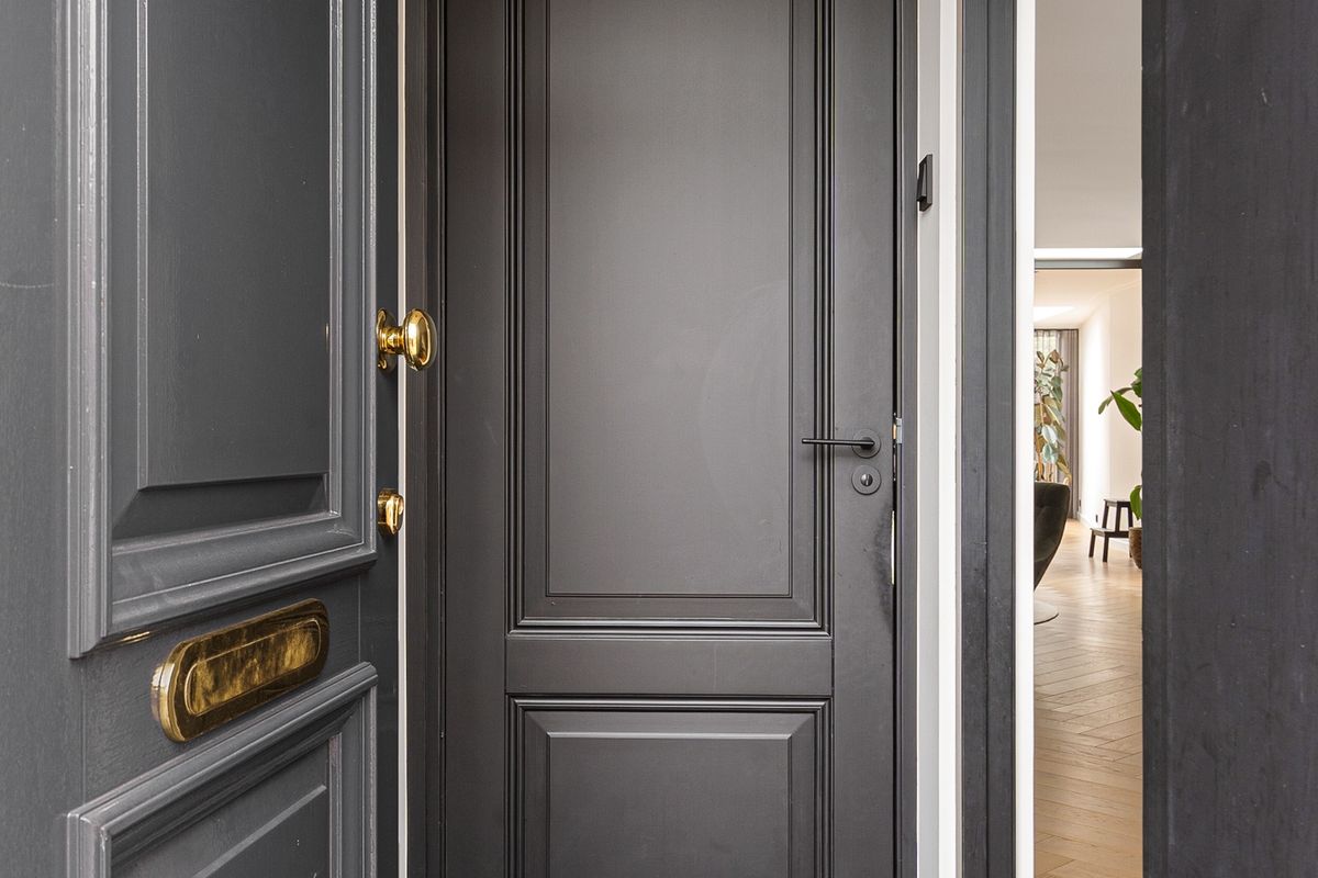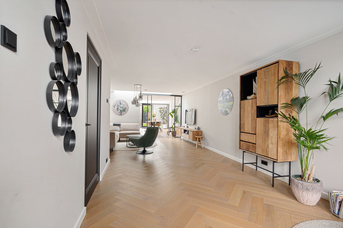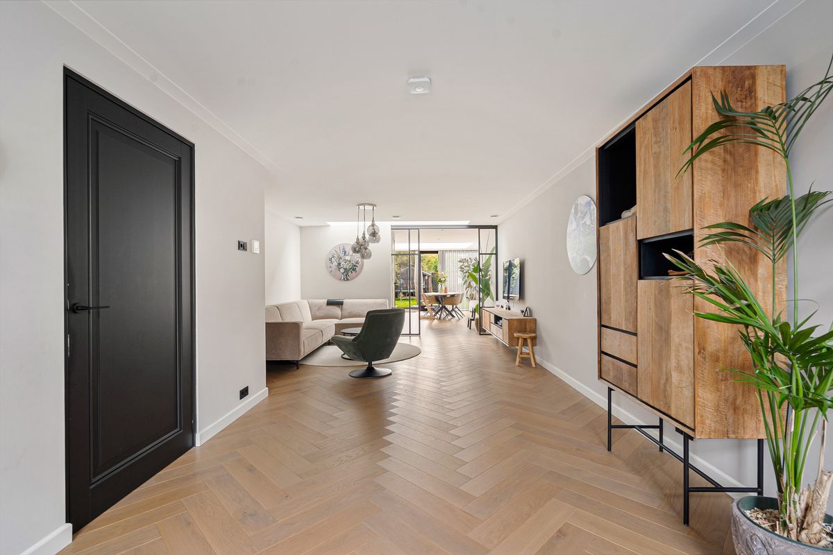 Entree via een stijlvolle voordeur naar de ruime hal met uitgebreide meterkast en modern toilet. Vanuit hier betreedt u de zeer royale woonkamer, afgewerkt met een prachtige vloer in visgraat met vloerverwarming, hoge plinten, strakke wanden en plafonds, en sfeervolle shutters.