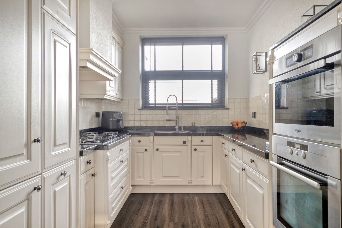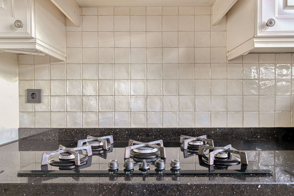 De keuken is opgesteld in een praktische U-vorm en afgewerkt in een landelijke stijl met crèmekleurige kastfronten en groefpatroon. Uiteraard is deze voorzien van alle benodigde inbouwapparatuur, waaronder een koel-vriescombinatie, (combi)oven, vaatwasser, gaskookplaat en afzuigkap.