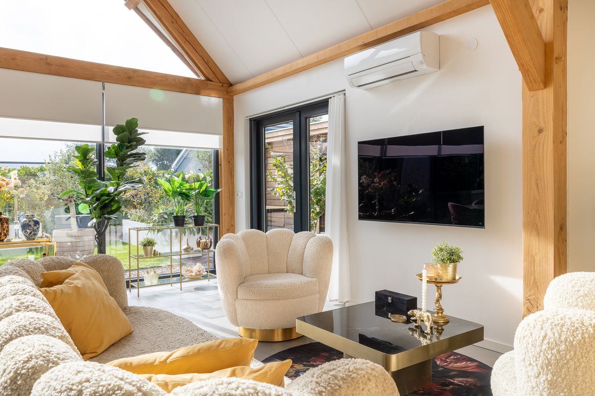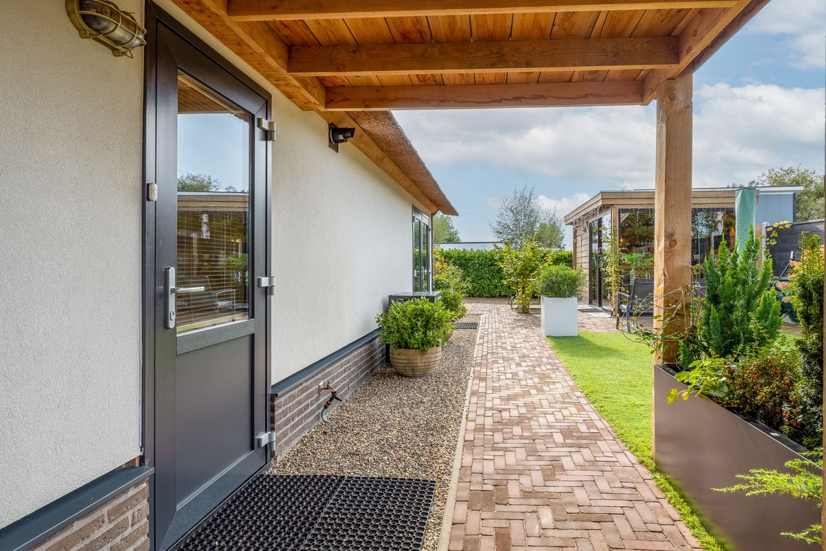 De recreatiewoning met rieten kap is opgeleverd in 2020 en is instapklaar met een prachtig onderhoudsvriendelijke tuin met een gezellige overdekte bar.