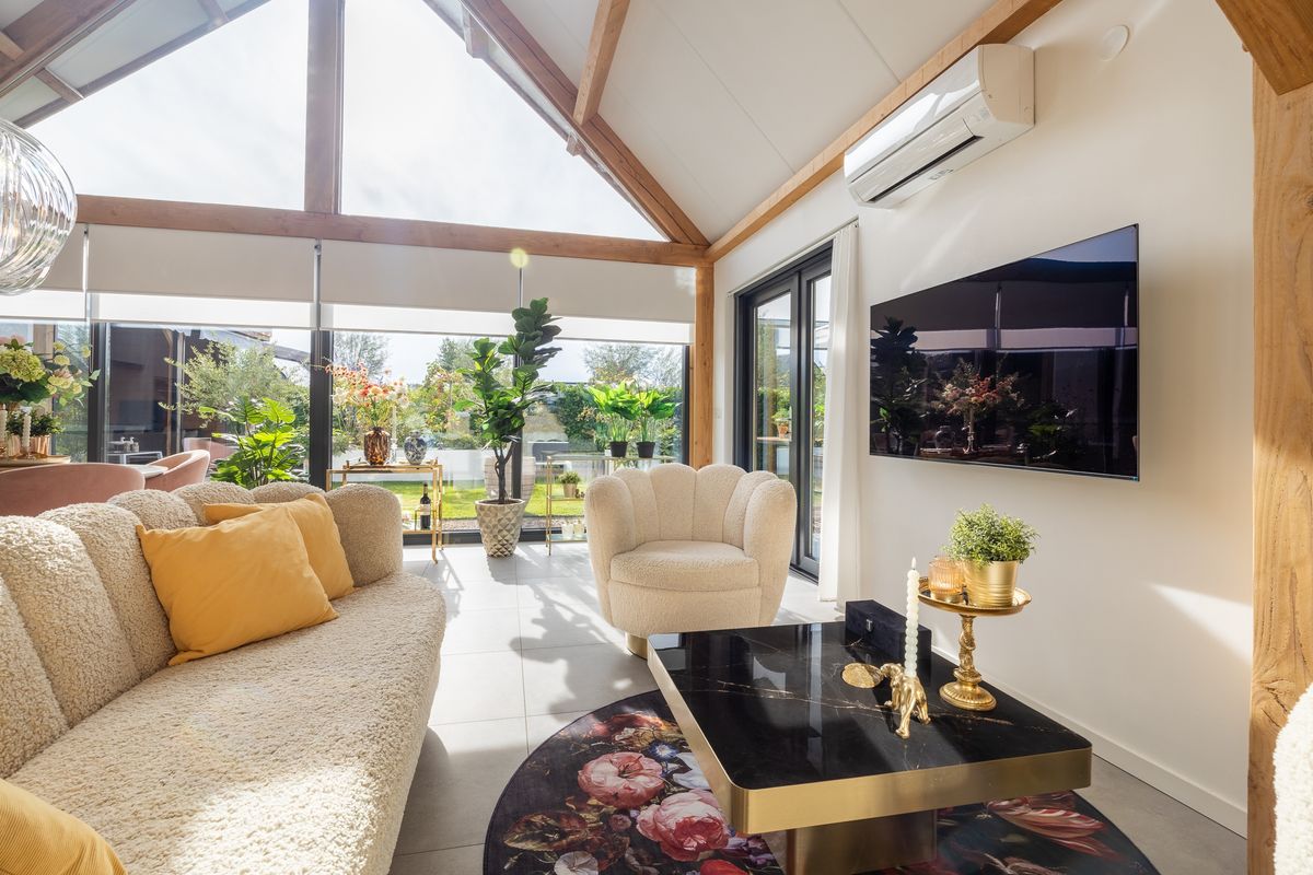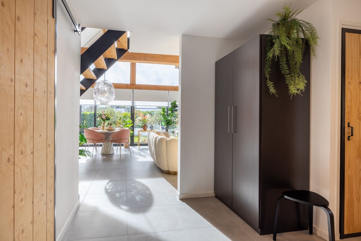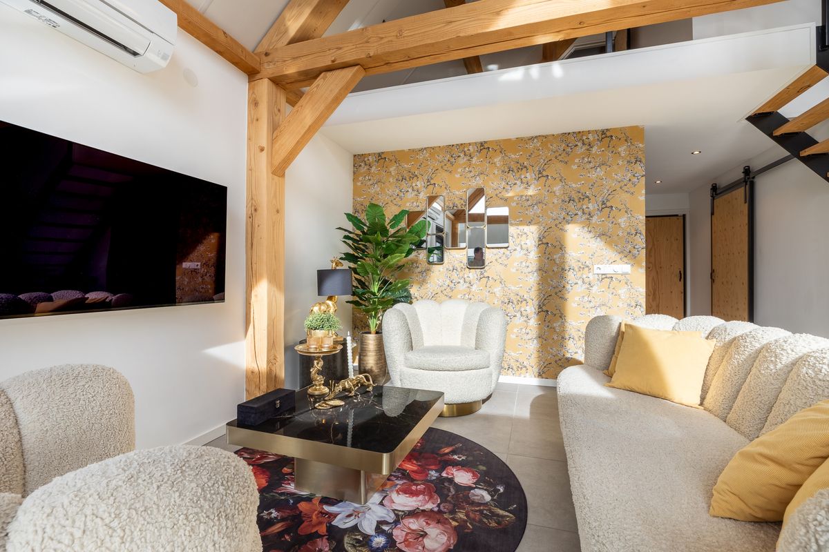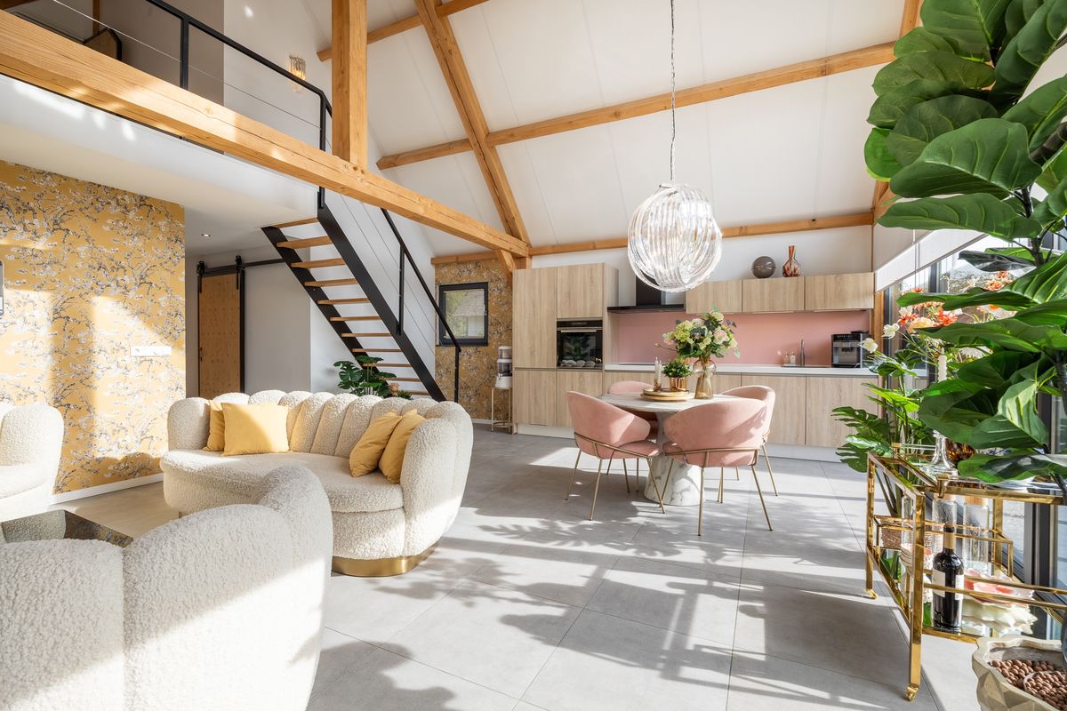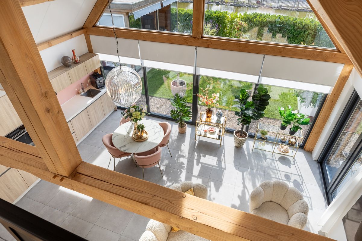 De lichte woonkamer is voorzien van een airco, open keuken en de trapopgang naar de vide/verdieping. Door de grote raam partijen is er veel daglicht toetreding.