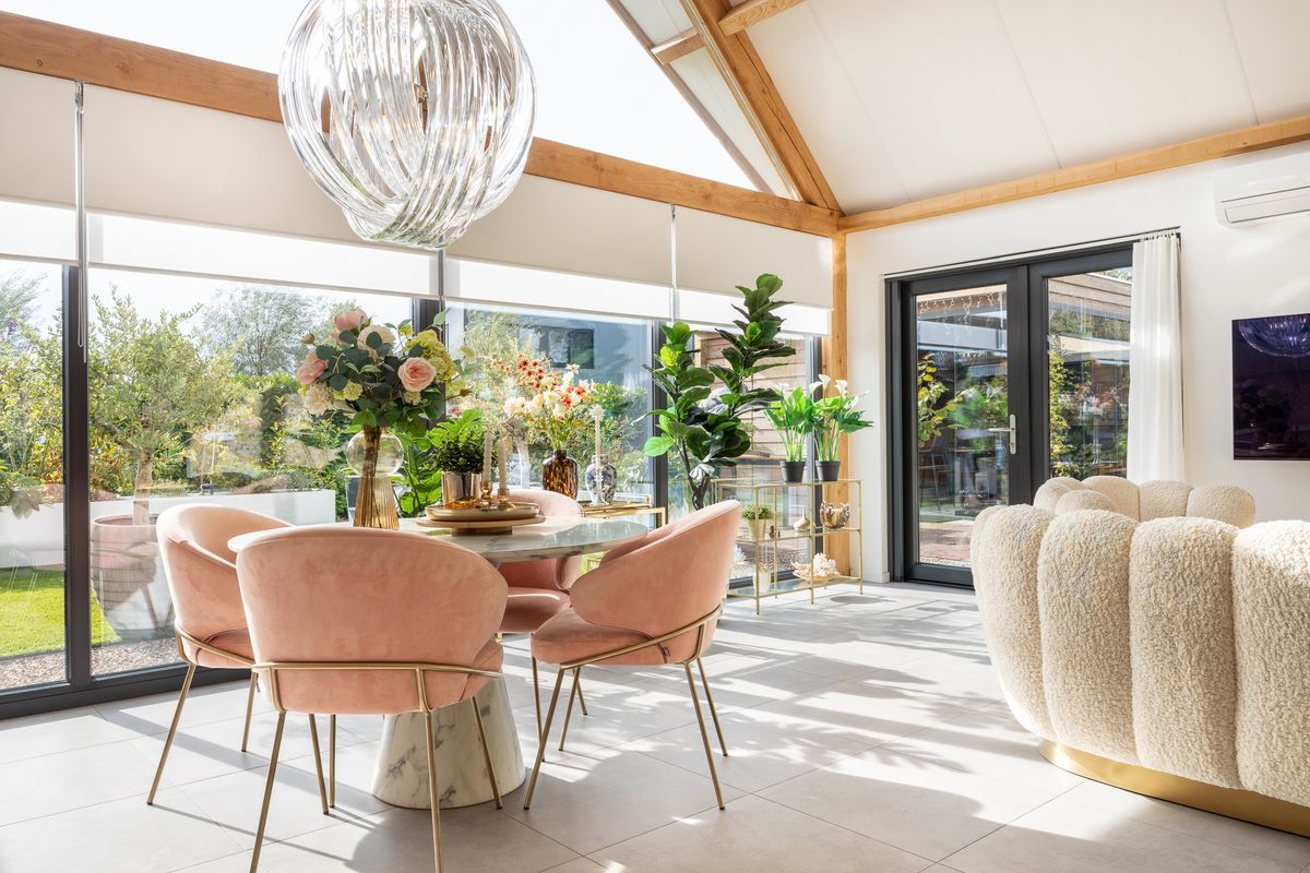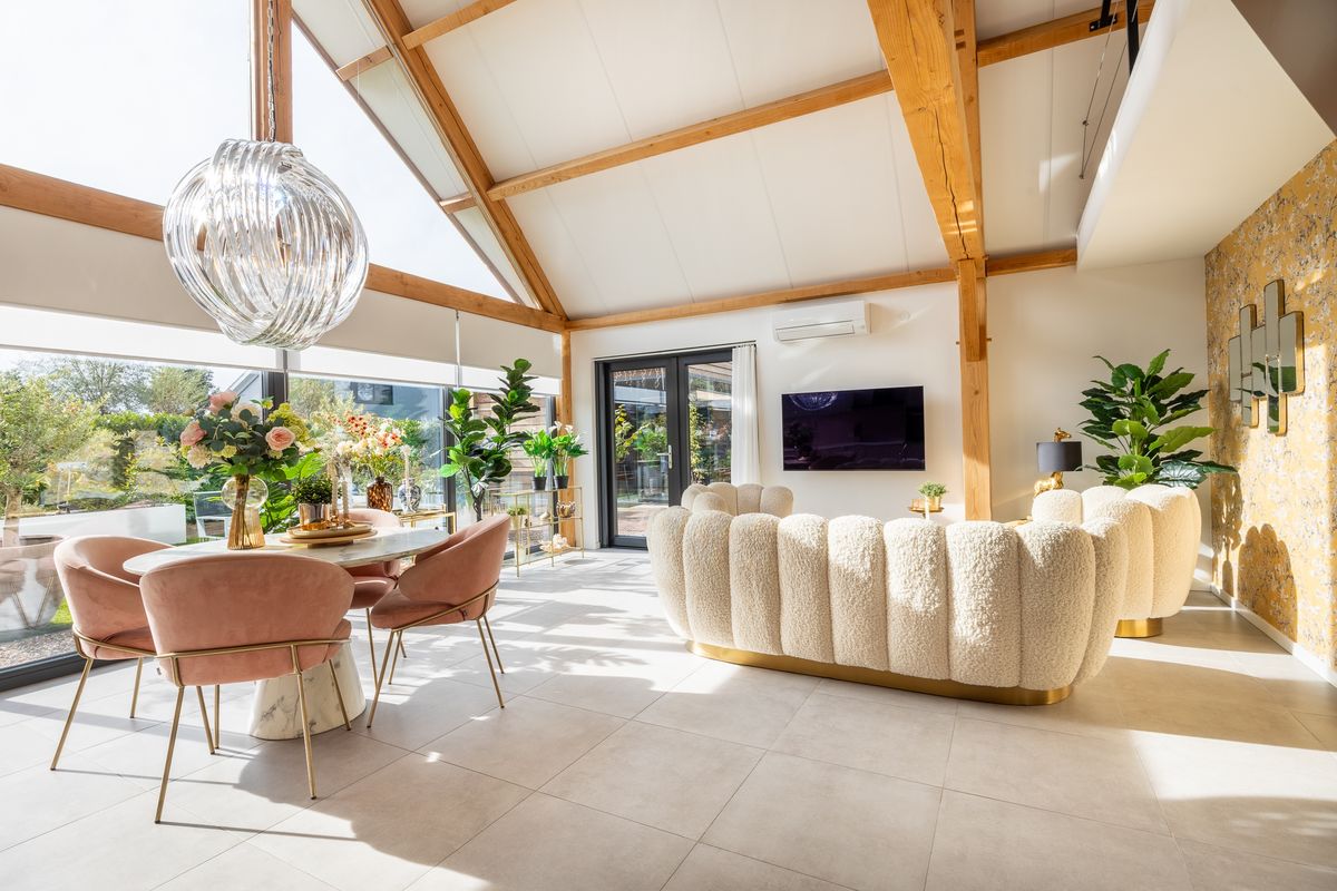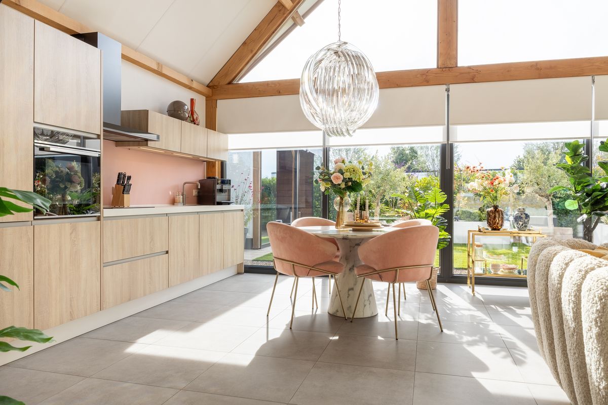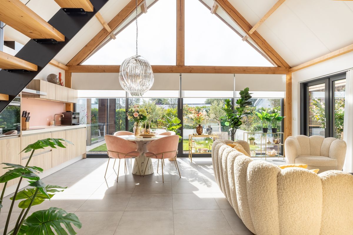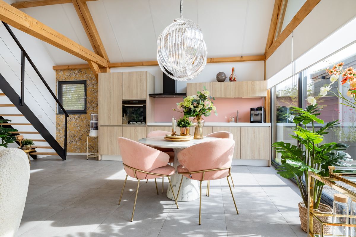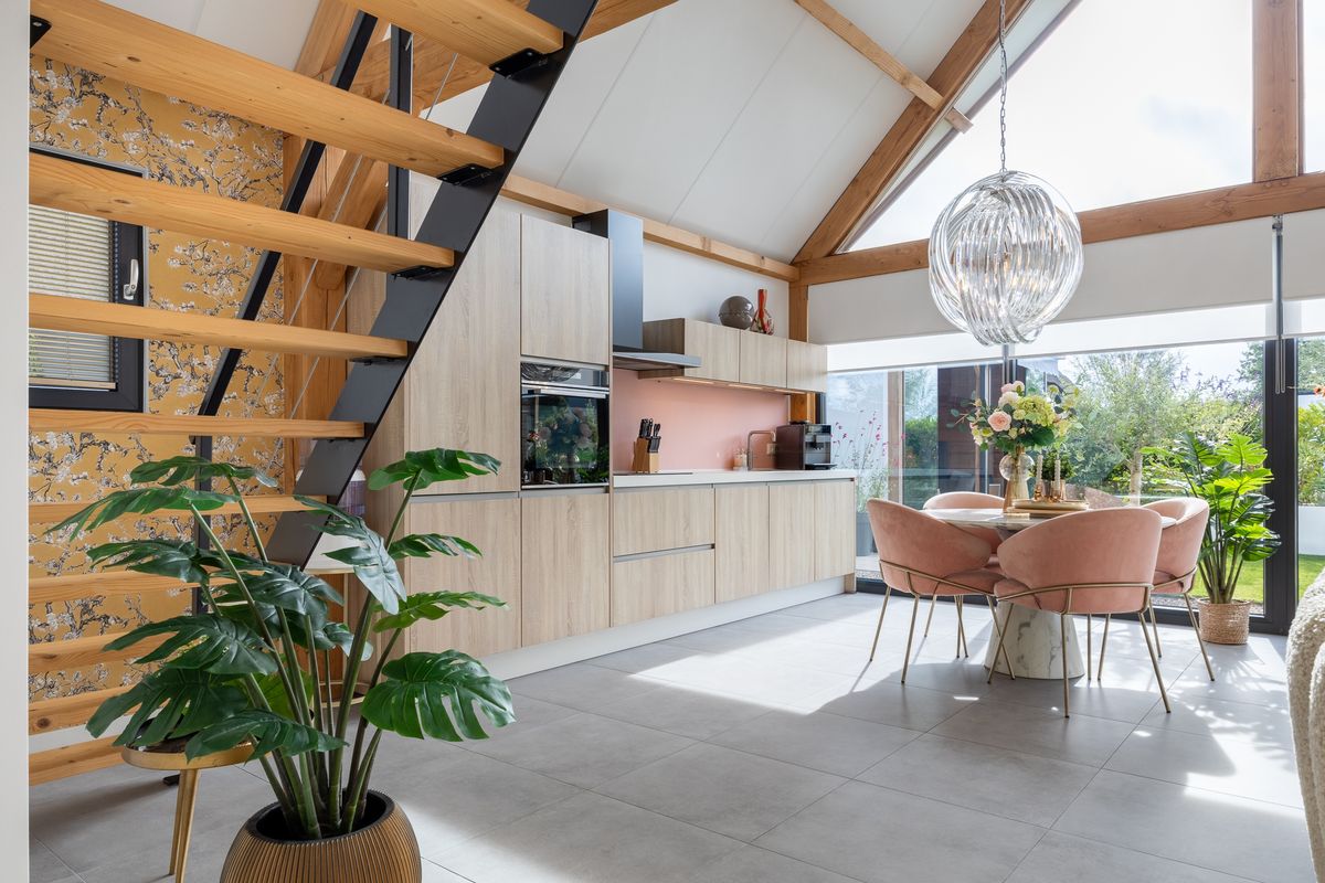 De lichte woonkamer is voorzien van een airco, open keuken en de trapopgang naar de vide/verdieping. Door de grote raam partijen is er veel daglicht toetreding.