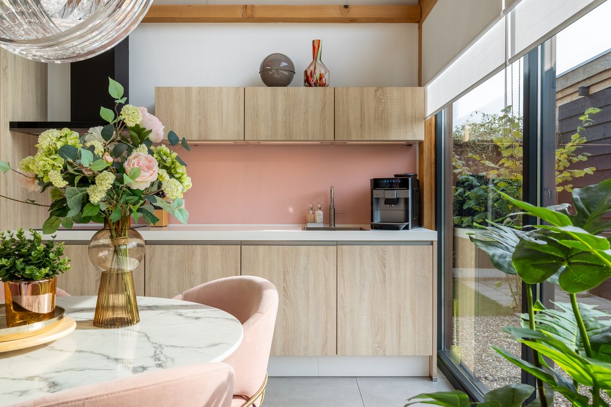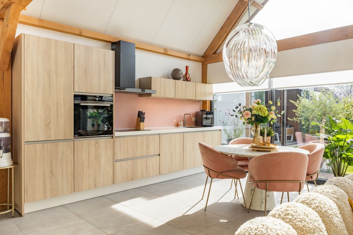 De keuken is uitgevoerd in een recht opstelling met diverse boven- en onderkasten. De keuken heeft een 4 pits inductie kookplaat, een afzuigkap, een combimagnetron, een Quooker kraan, een koelkast en vriezer. Door de open keuken sta je direct in verbinding met de leefruimte en door de rechte opstelling is er ruimte voor een eettafel.