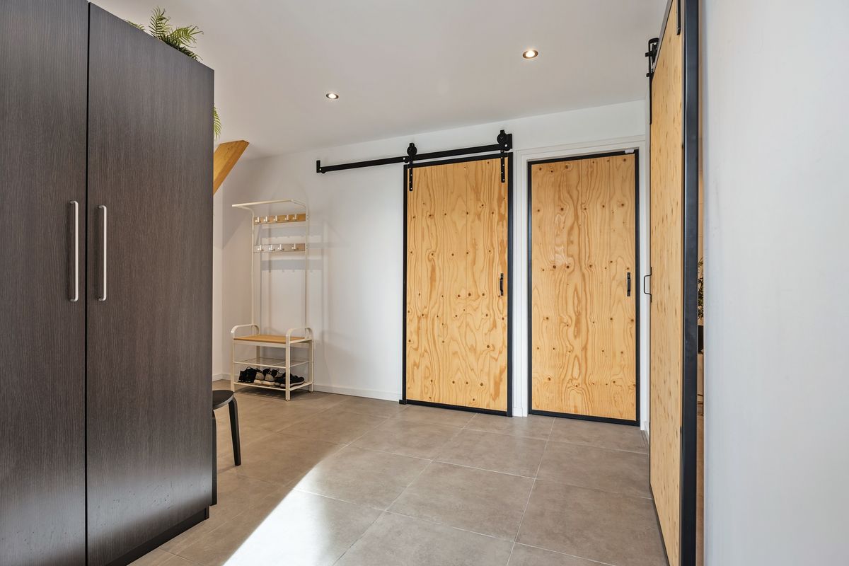 De inkomhal biedt toegang tot de slaapkamers op de begane grond, badkamer, technische ruimte en de woonkamer. De volledige woning heeft een tegelvloer op de begane grond met vloerverwarming.