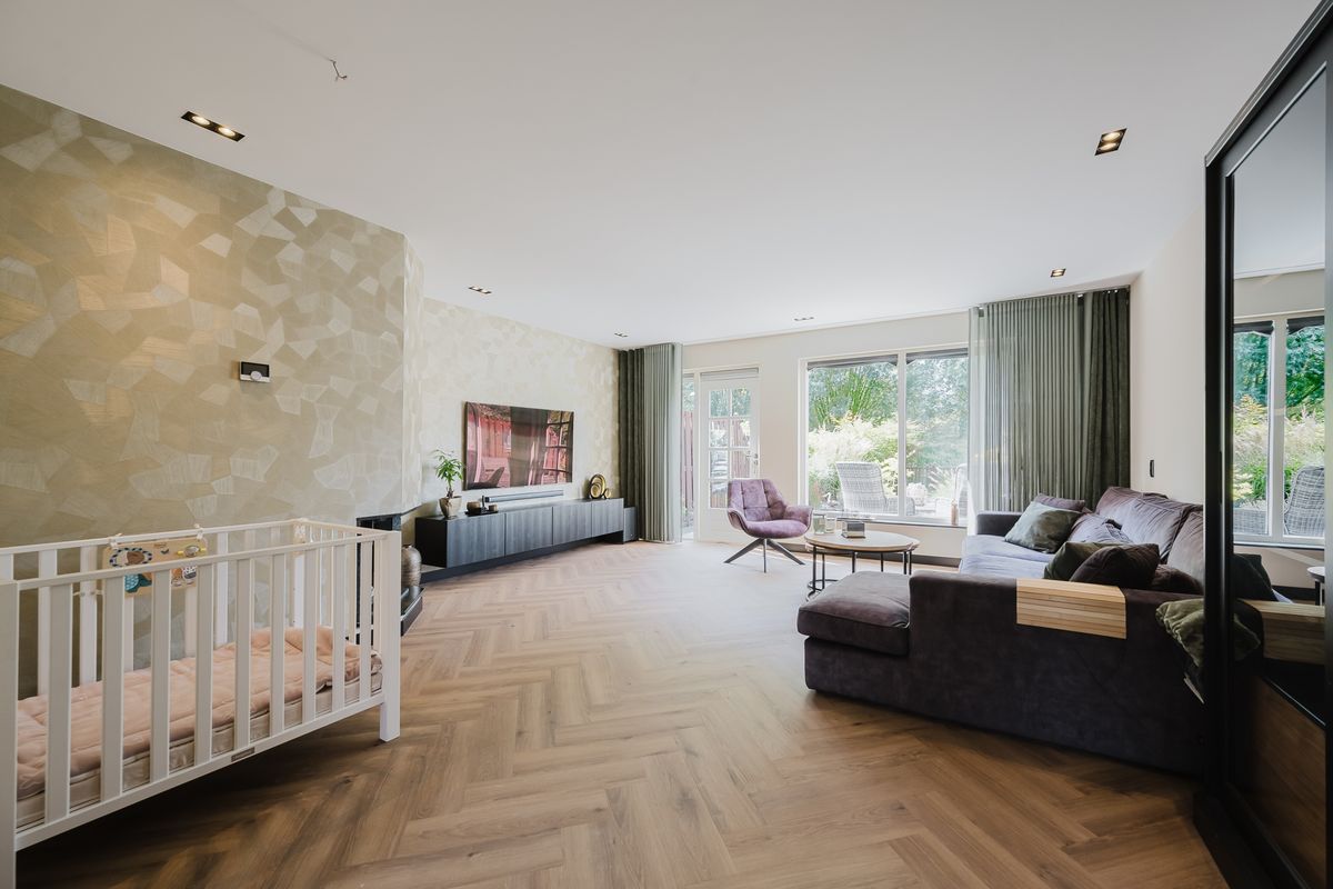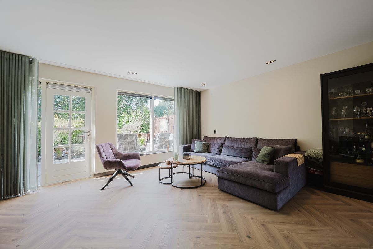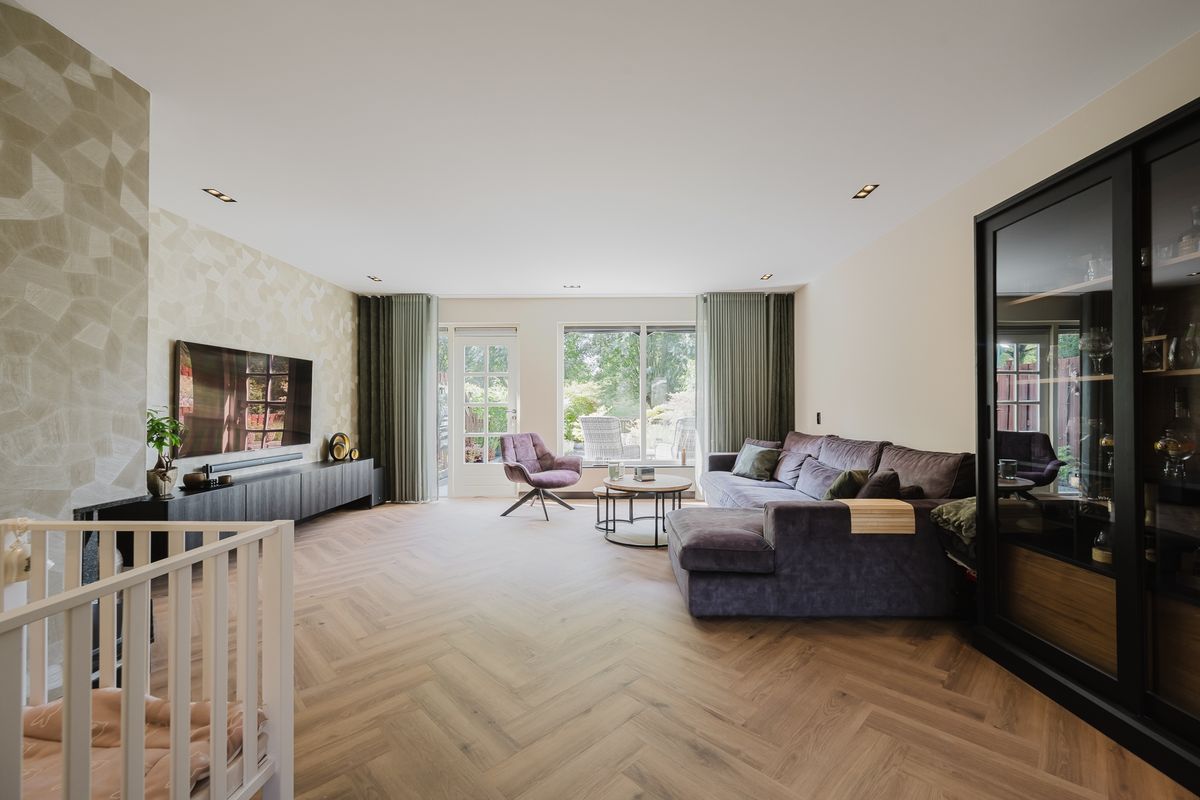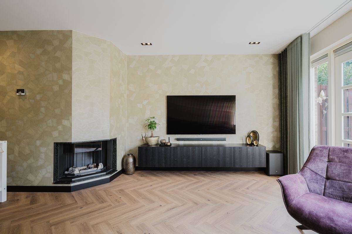 De woonkamer is voorzien van een strak gestukte wandafwerking (2023), heeft een sfeervolle gashaard en het verlaagde plafond met spotjes zorgt voor een luxe uitstraling.