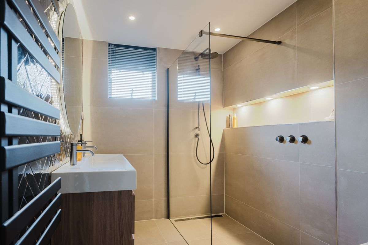 De badkamer is in 2023 volledig gerenoveerd, heeft een luxe afwerking en is voorzien van elektrische vloerverwarming, heeft een ruime inloopdouche, een dubbele wastafel met meubel en een spiegel met verlichting/verwarming.