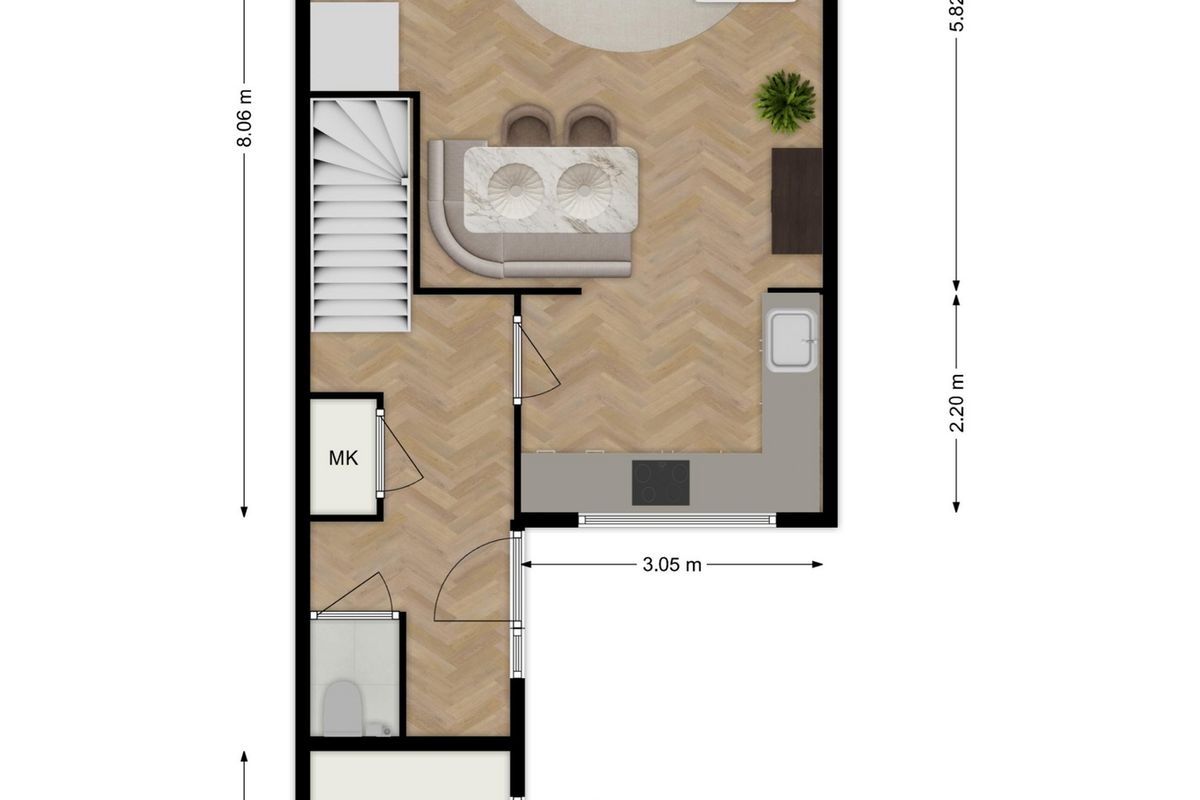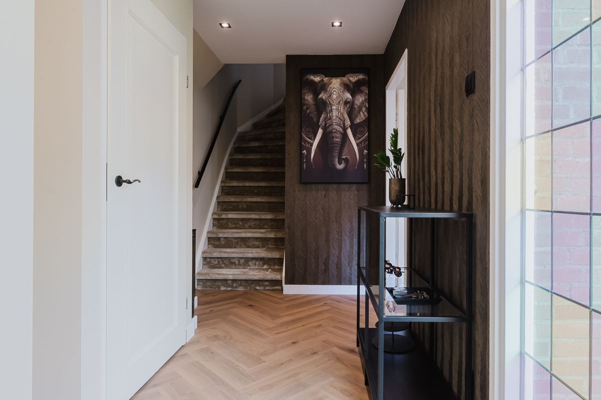 De volledige begane grond is in 2023 voorzien van een stijlvolle pvc-vloer in visgraatmotief met vloerverwarming.