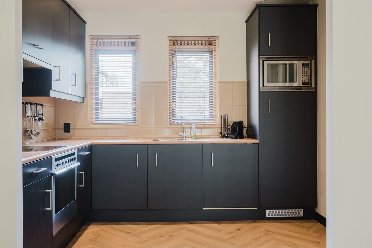 De open keuken in L-opstelling is recent gewrapt in een donkere eiken look en is voorzien van een 4-pits inductie kookplaat met oven, een magnetron, een koelkast en vriezer en heeft voor warm water een 10 liter close-in boiler.
