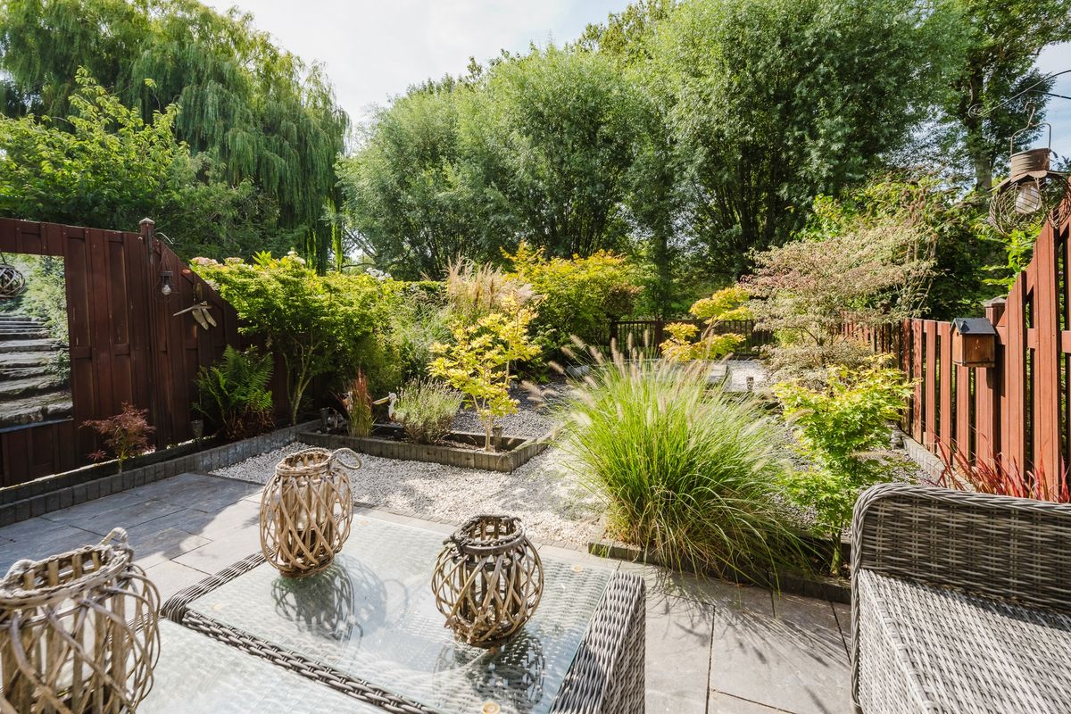 De voortuin geeft toegang tot de aangebouwde stenen berging en de woningentree.