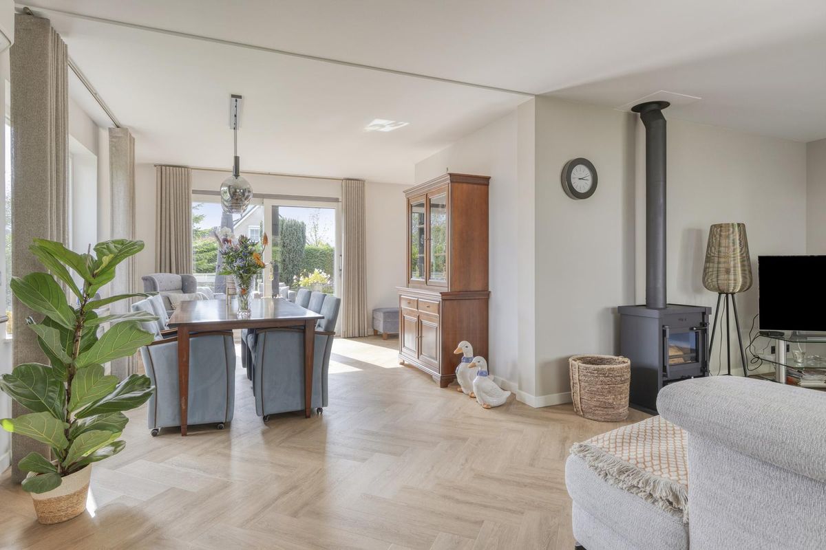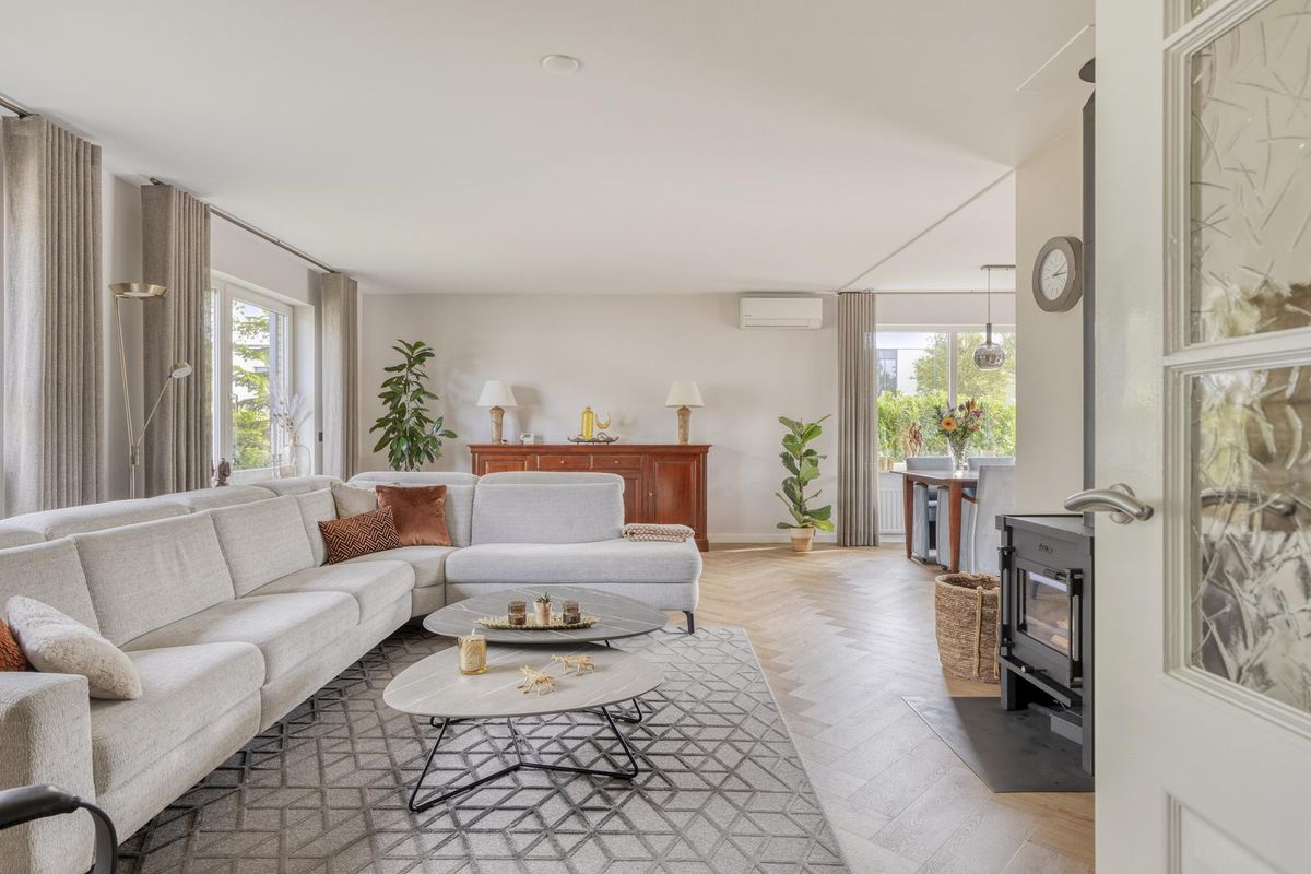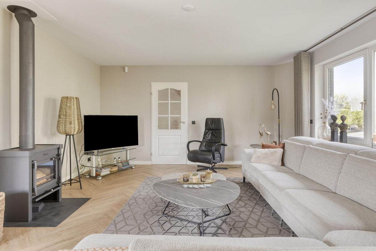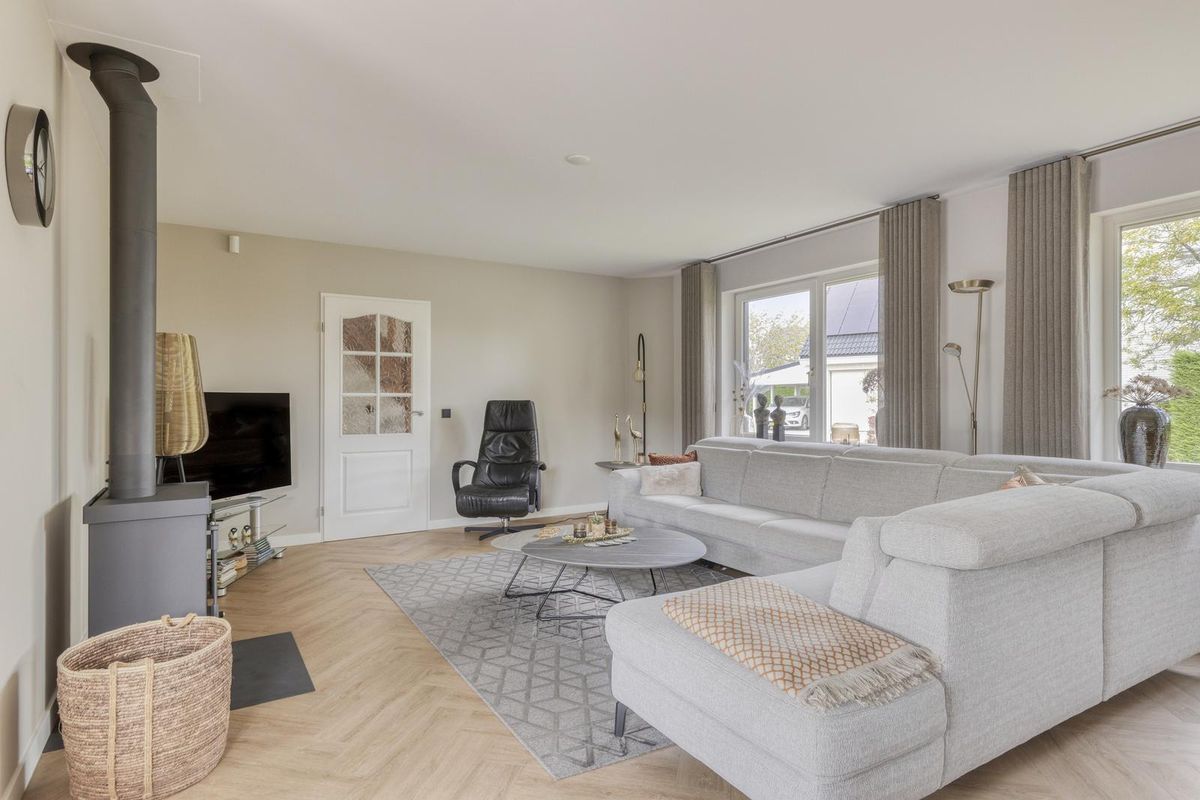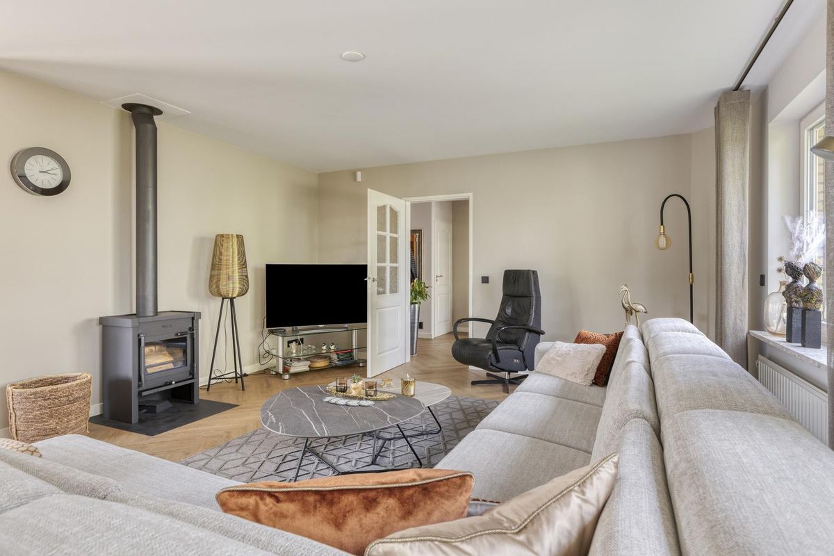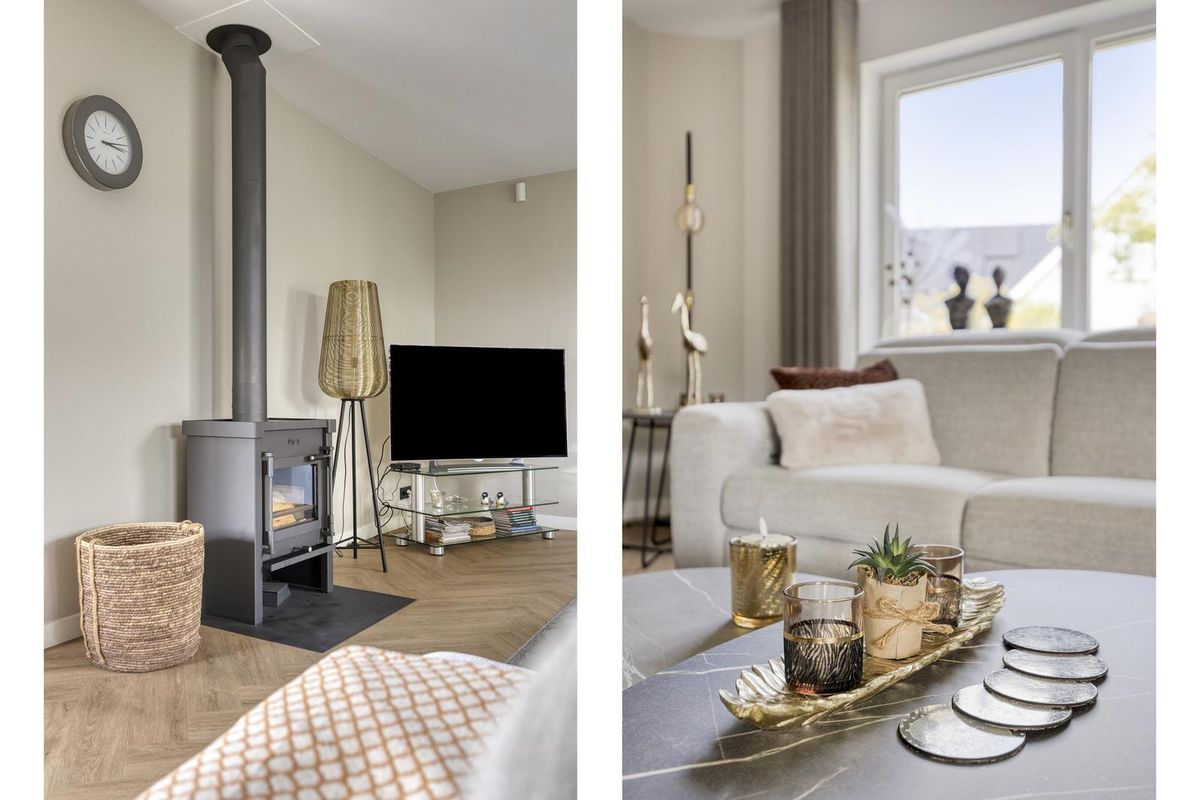 U komt binnen in de hal met de meterkast, het toilet en de trap naar boven. Mede door de vide, maar ook door de strak gestuukte wanden en plafond is het direct een warm welkom. Vanuit de hal loopt u door naar de ruime en lichte woonkamer. De wanden en plafonds zijn hier eveneens gestuukt en de vloer is afgewerkt met een moderne pvc visgraatvloer met vloerverwarming. Er is een gezellige houtkachel en genoeg plek voor zowel een zit- als eethoek. De halfopen keuken is luxe uitgevoerd en van alle gemakken voorzien. Aansluitend vindt u de bijkeuken, met aansluitingen voor wasmachine en droger. Vanuit hier heeft u toegang tot de tuin en de inpandige garage. De tuin met zonneterras is eveneens bereikbaar vanuit de eethoek via een schuifpui.