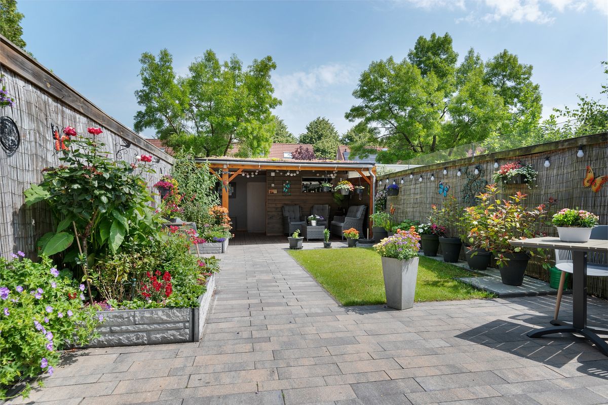 De achtertuin is diep, zonnig en onderhoudsvriendelijk aangelegd met een combinatie van sierbestrating, gras en kleurrijke borders. Achterin tref je een gezellige overkapping waar je ’s zomers tot in de late uurtjes buiten kunt zitten. Ook is er een gemetselde berging en een achterom die direct toegang geeft tot de parkeerplaats achter de woning – hier is altijd voldoende plek voor de auto!