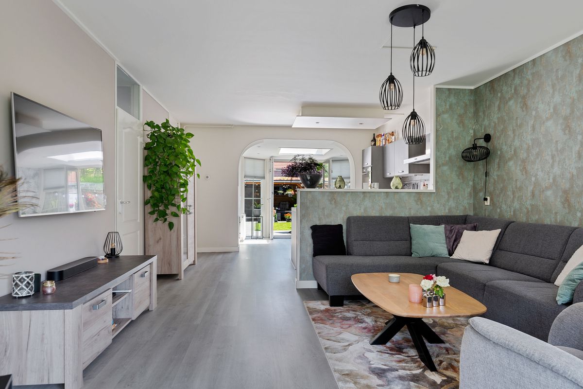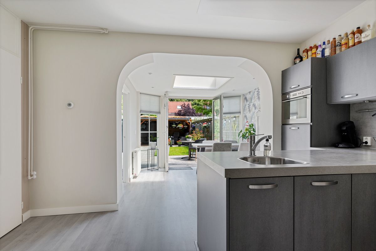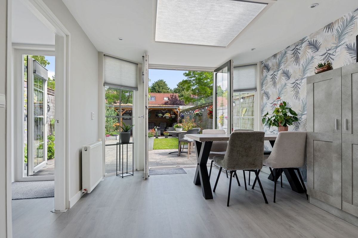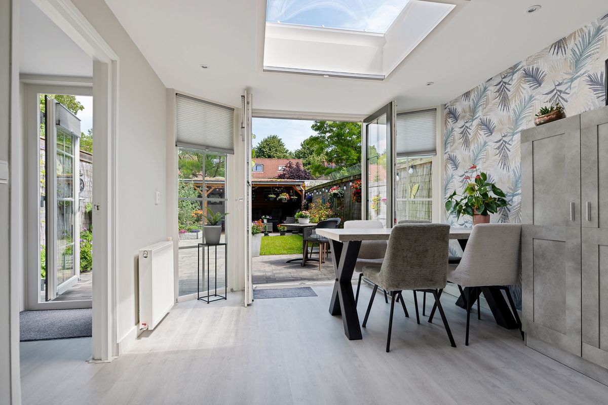 Via de entree met meterkast en trapkast stap je de straatgerichte woonkamer binnen. Dankzij de grote raampartijen geniet je hier van een fijne lichtinval en een prettige leefruimte. De open keuken is voorzien van diverse inbouwapparatuur en sluit perfect aan op de royale tuingerichte eetkamer in de uitgebouwde achterzijde van de woning. Hier is het heerlijk vertoeven: het daklicht zorgt voor extra veel licht en via de dubbele openslaande deuren stap je zo de tuin in.