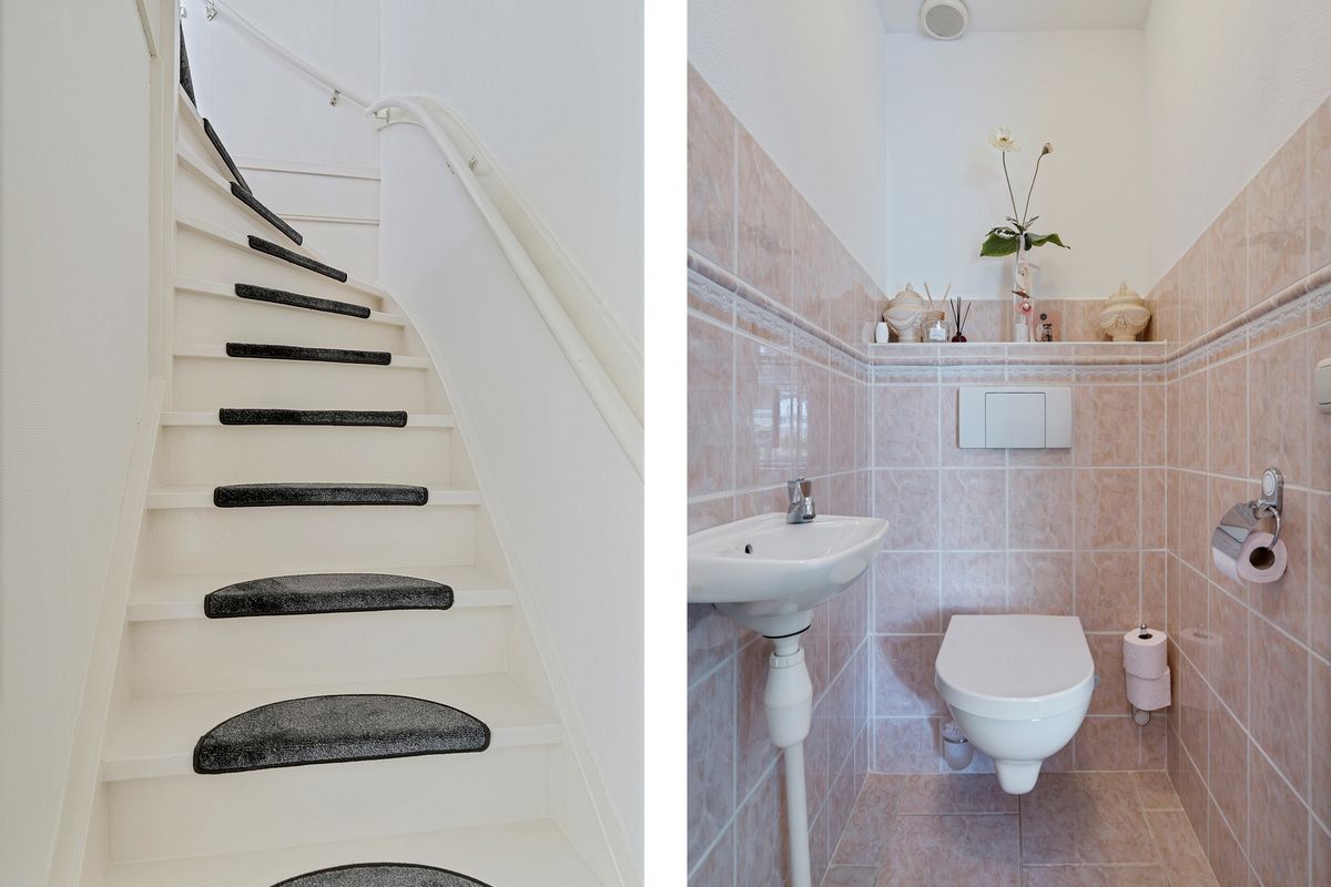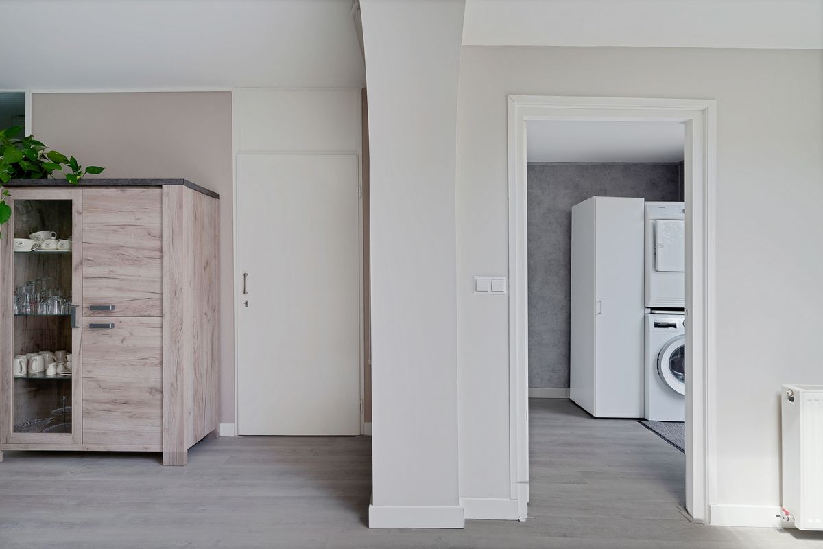 Grenzend aan de eetkamer vind je de praktische bijkeuken met aansluitingen voor wasmachine en droger, plus een extra loopdeur naar buiten. Het toilet bevindt zich in de hal bij de trapopgang.