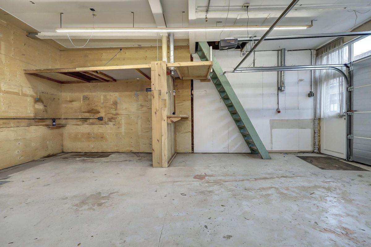 De begane grond is een open ruimte met betonvloer, meterkast, twee loopdeuren en een brede garagedeur. De ruime garage beschikt over krachtstroom, wat extra mogelijkheden biedt voor hobbyisten, vakmensen of het opladen van een elektrische auto.