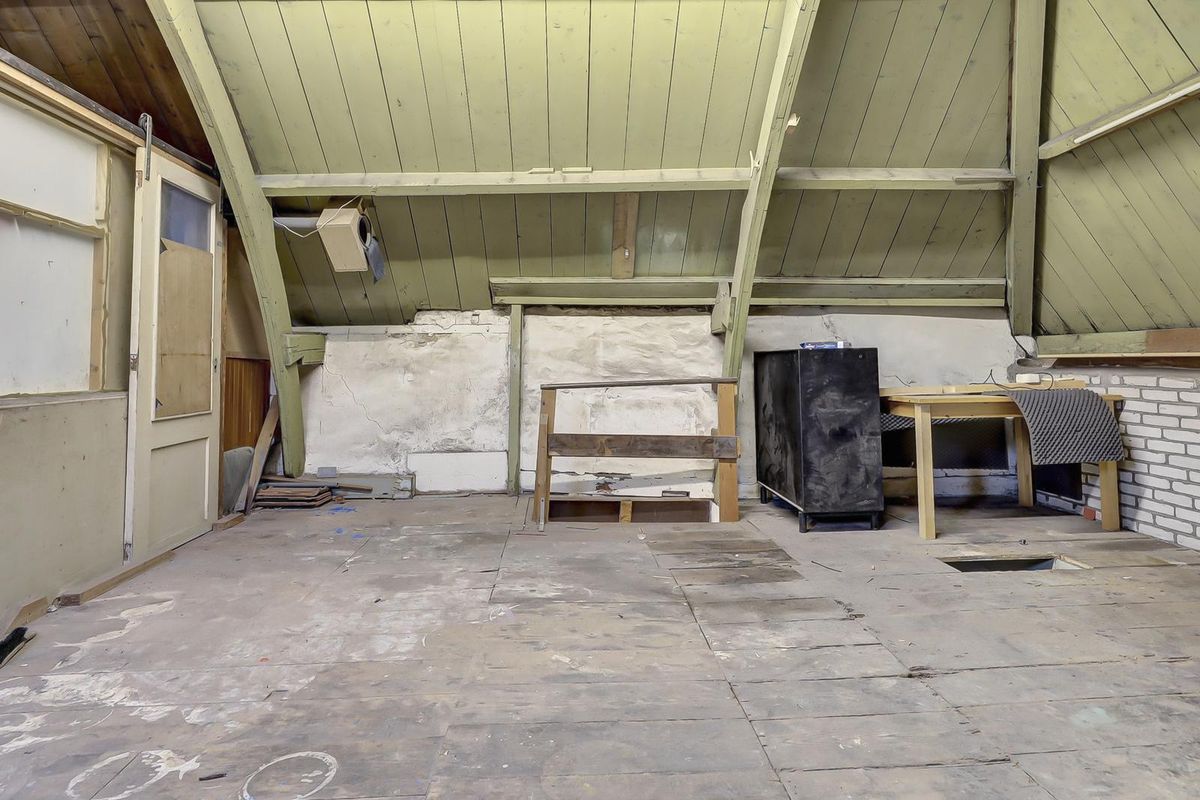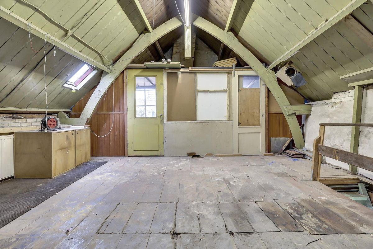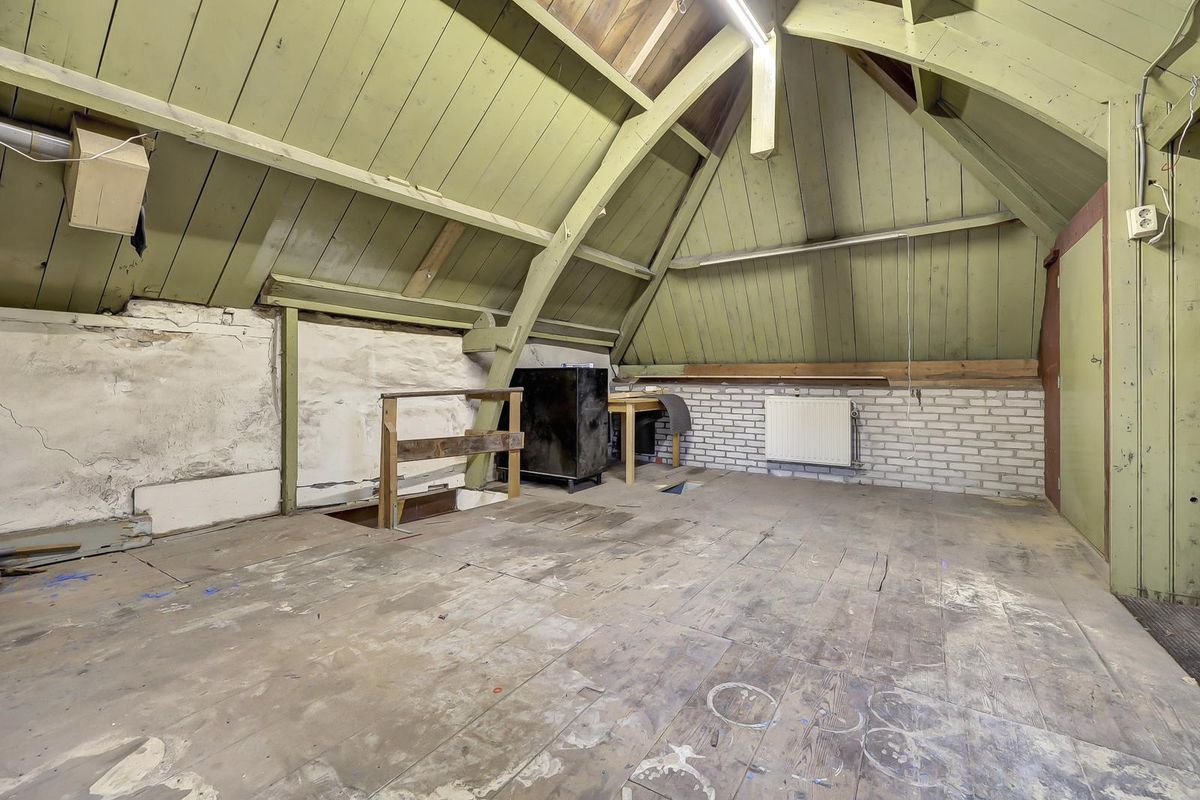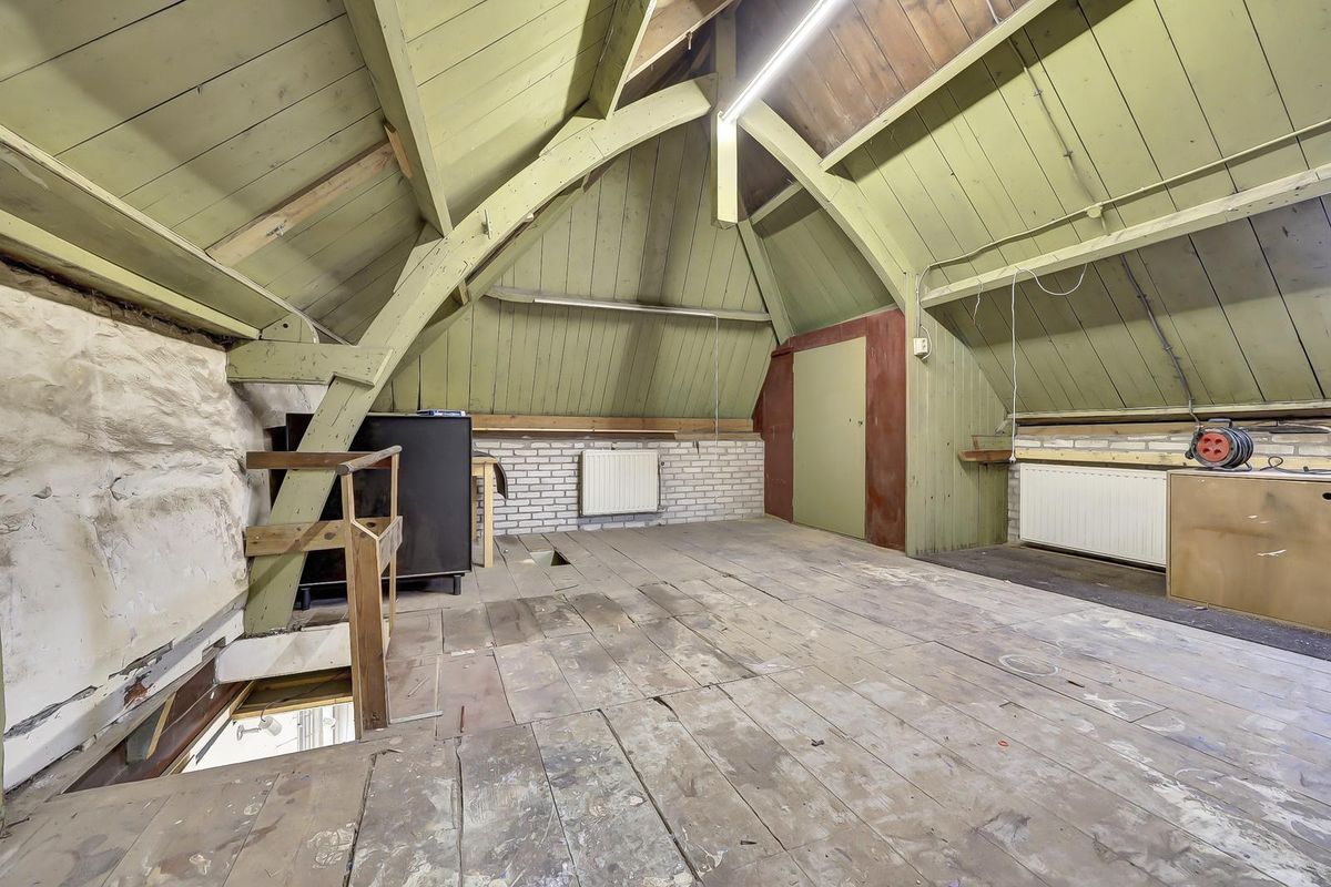 Een trap biedt toegang tot de verdieping met stahoogte, daglicht en elektra. Er zijn een grote open zolder en twee afgetimmerde kamertjes.