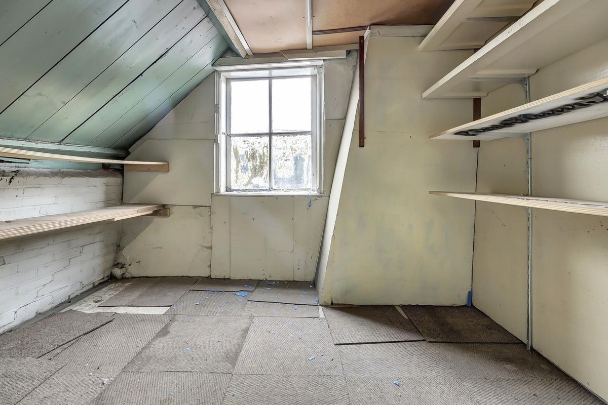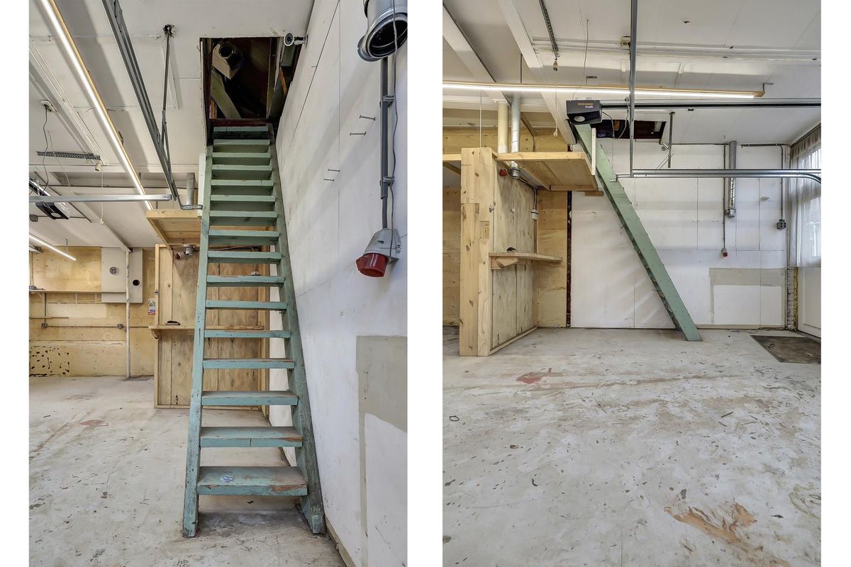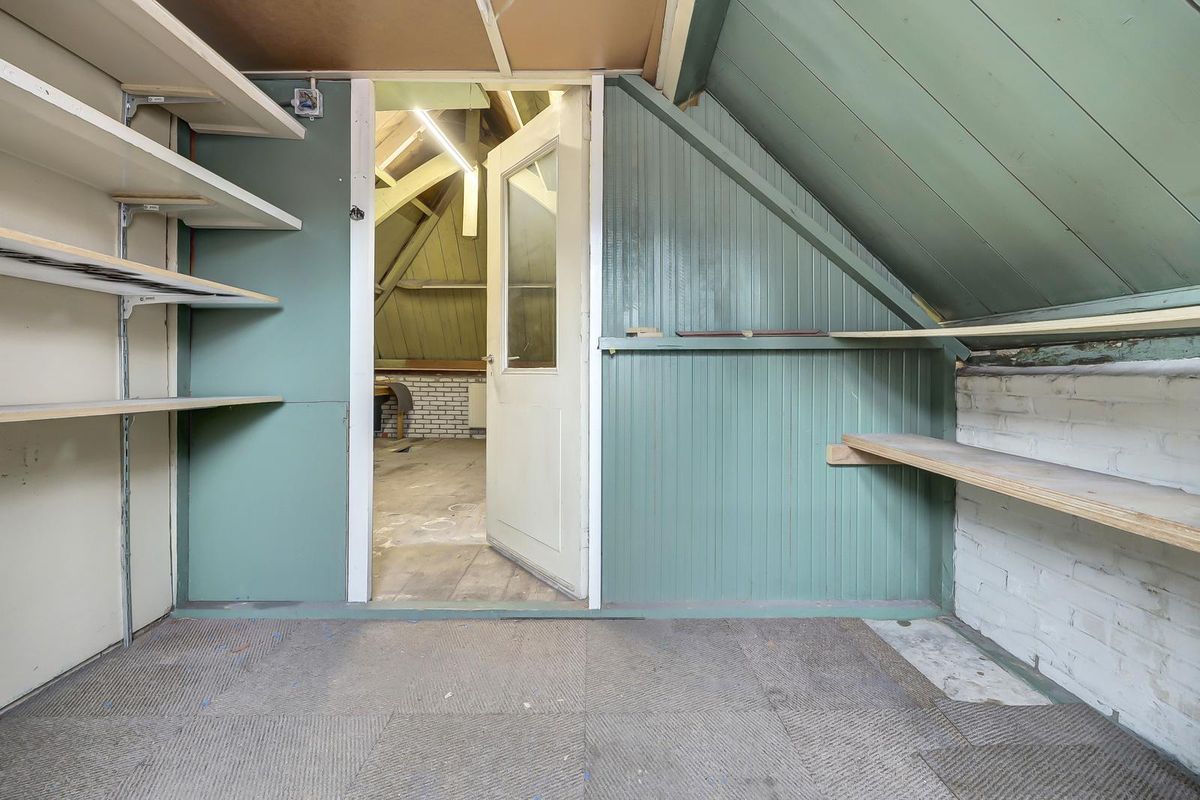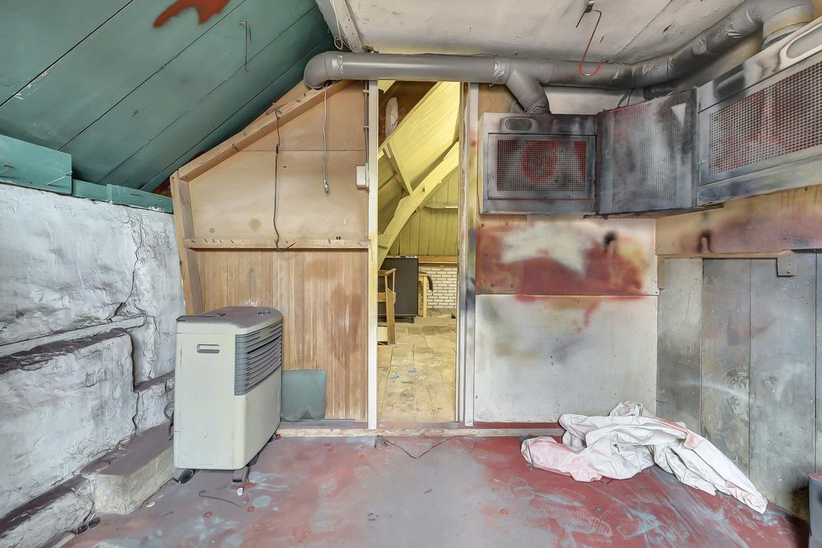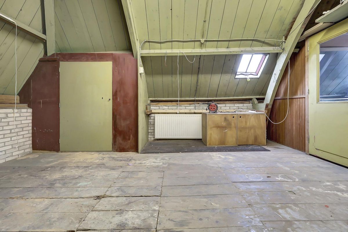 Een trap biedt toegang tot de verdieping met stahoogte, daglicht en elektra. Er zijn een grote open zolder en twee afgetimmerde kamertjes.
