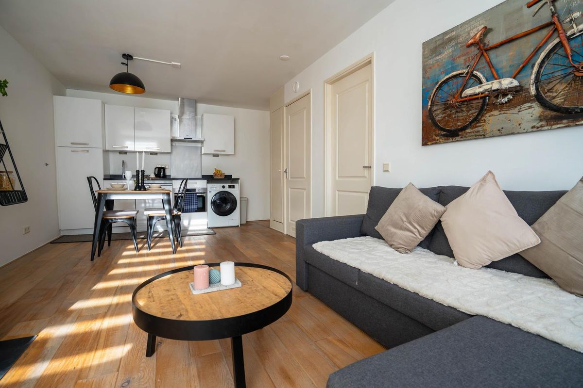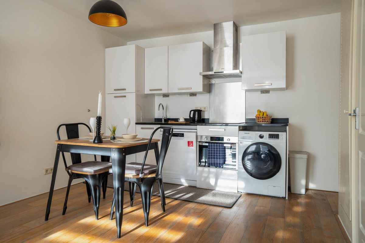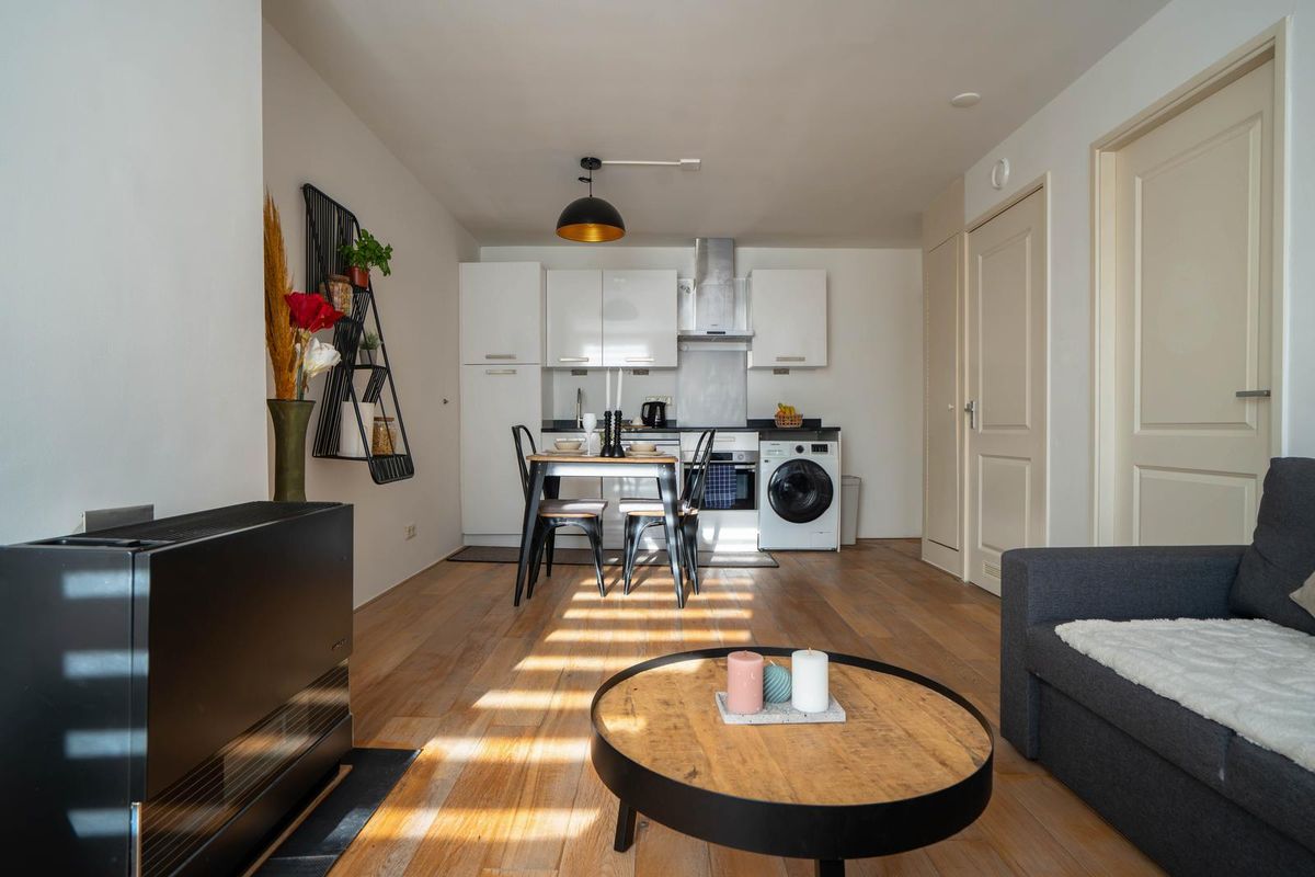 Wanneer je binnenkomt, bevindt de meterkast zich aan de linkerkant. Vervolgens loop je de woonkamer met open keuken binnen. De keuken is uitgerust met diverse inbouwapparatuur en beschikt over een aansluiting voor de wasmachine. Vanuit de woonkamer geven twee deuren toegang tot de slaapkamer en de badkamer met toilet.