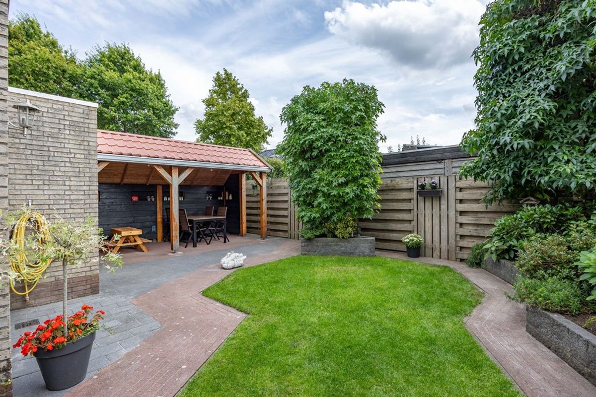 De achtertuin is strak aangelegd met een combinatie van gras, vaste beplanting en een fraaie overkapping. Een heerlijke plek om te genieten van de buitenlucht. Zowel via de bijkeuken als via de garage is de tuin bereikbaar, wat zorgt voor gemak in het dagelijks gebruik.