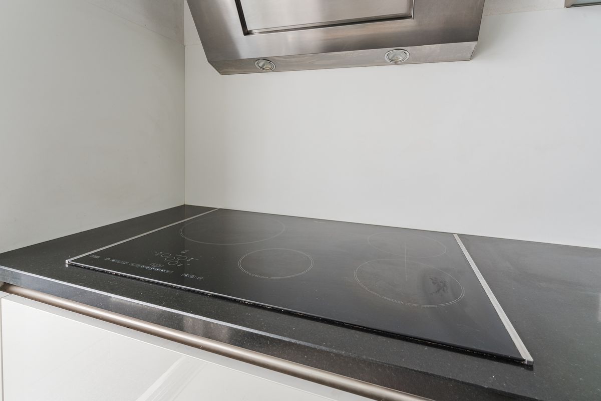 There are also plenty of modern built-in appliances, such as a dishwasher, induction hob (with a diagonal extractor hood above it), oven, refrigerator, and freezer.