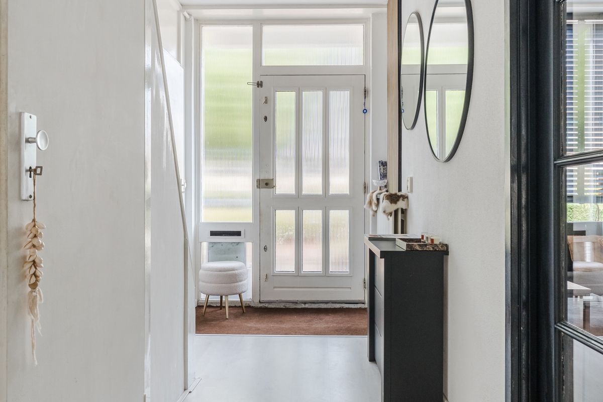 In de entree zit ook de sierlijke, transparante toegangsdeur tot de woonkamer.