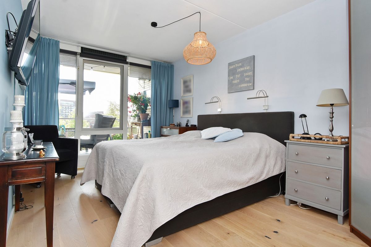 Het appartement beschikt over drie slaapkamers: twee ruime en een iets kleinere, die momenteel in gebruik is als thuiswerkplek. De moderne badkamer is centraal gelegen en voorzien van een stijlvolle inloopdouche en een fraai wastafelmeubel.