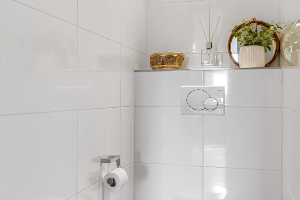 De badkamer is een oase van rust en luxe. Met een ruime inloopdouche, een stijlvol wastafelmeubel en een grote spiegel voelt het als een mini-spa. De lichte wandtegels en de moderne afwerking zorgen voor een ruimtelijk en fris gevoel. Hier begin je je dag goed!