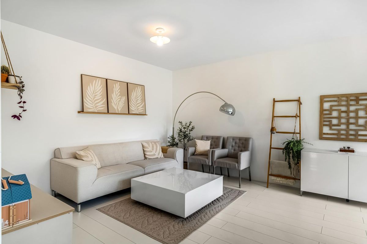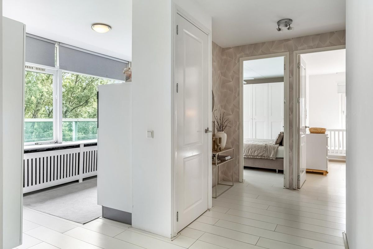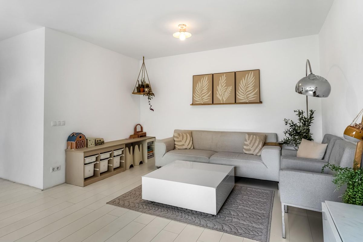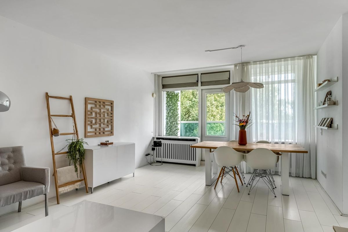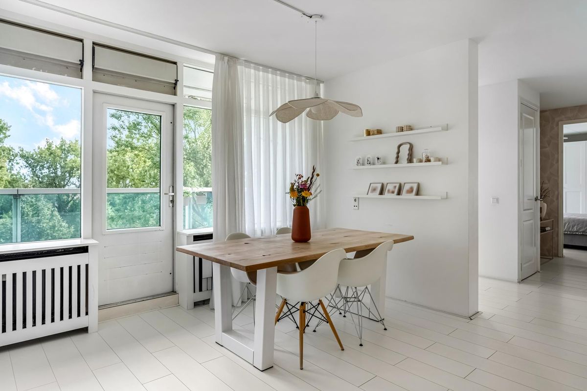 De woonkamer is een heerlijke plek om thuis te komen. Dankzij de grote ramen valt er veel daglicht naar binnen en geniet je van een uitzicht op de hoge bomen. De strakke afwerking met lichte vloer en wanden geeft de ruimte een frisse uitstraling en vormt een ideale basis voor elke woonstijl. Vanuit de woonkamer stap je het balkon op, met groen uitzicht en toch de reuring van de stad.