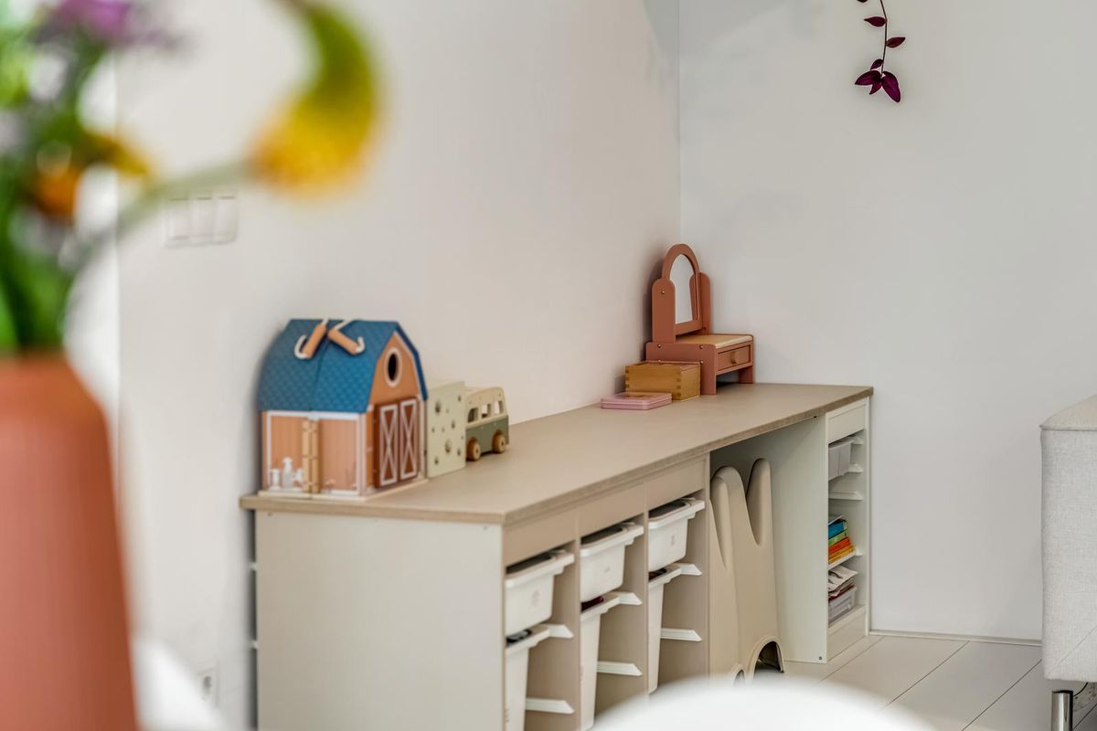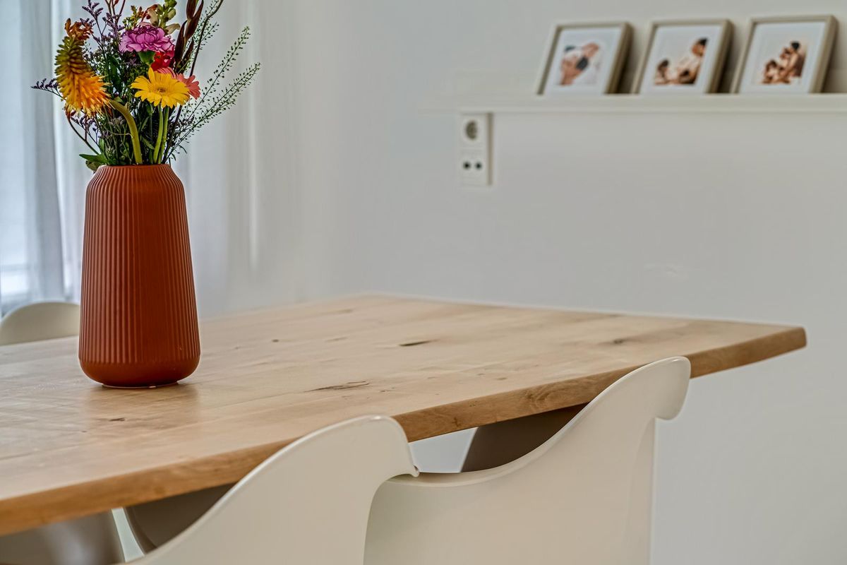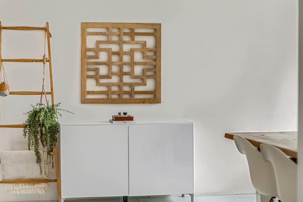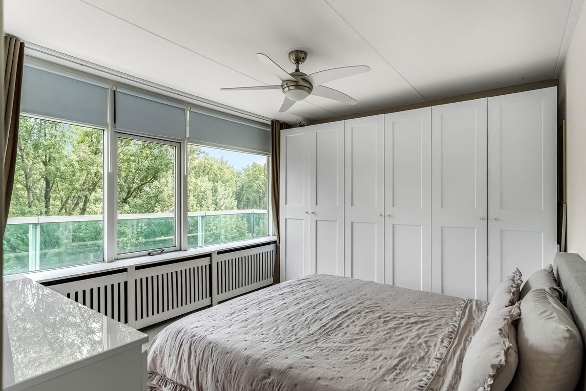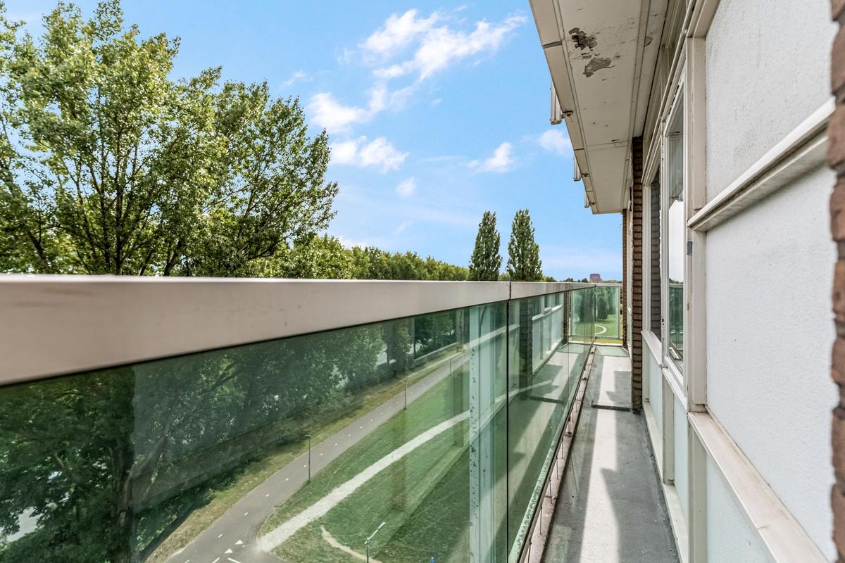 De woonkamer is een heerlijke plek om thuis te komen. Dankzij de grote ramen valt er veel daglicht naar binnen en geniet je van een uitzicht op de hoge bomen. De strakke afwerking met lichte vloer en wanden geeft de ruimte een frisse uitstraling en vormt een ideale basis voor elke woonstijl. Vanuit de woonkamer stap je het balkon op, met groen uitzicht en toch de reuring van de stad.
