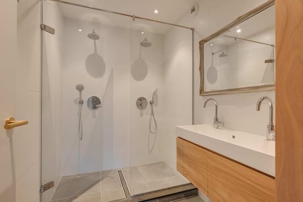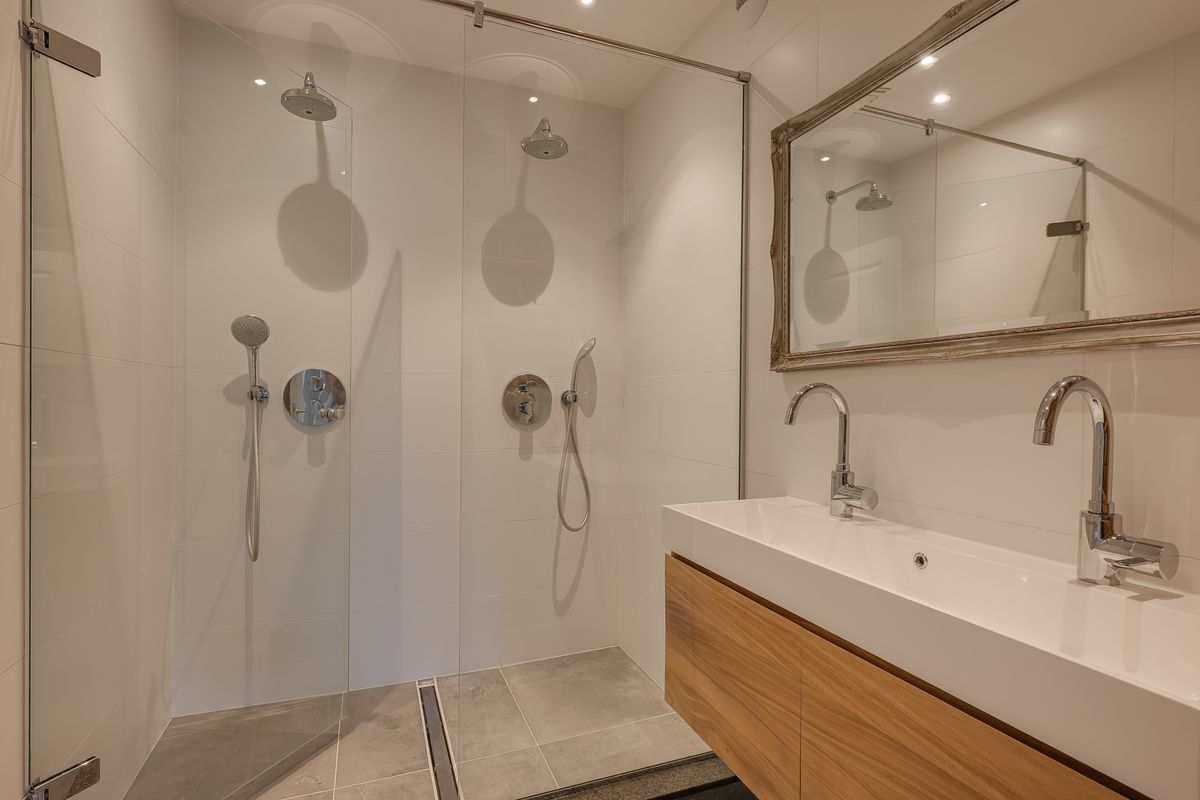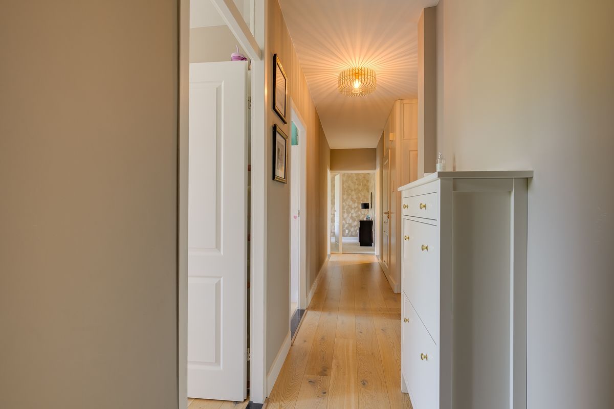 Je komt binnen via een verzorgd, afgesloten portiek met automatische deuren. De lift brengt je soepel naar de tweede etage. Zodra je de brede hal instapt, valt het meteen op: hier is ruimte, lucht en licht. Links passeer je het moderne zwevende toilet en de compleet vernieuwde badkamer – strak betegeld, met dubbele inloopdouche, dubbele wastafel en een luxe uitstraling die aan een hotel doet denken.