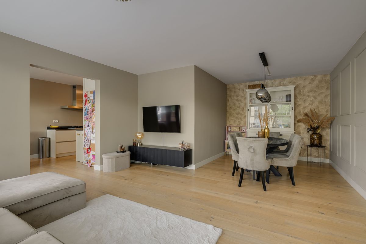 De woonkamer is royaal opgezet, een fijne plek waar het daglicht door de grote ramen naar binnen stroomt en je uitzicht hebt op het groen rondom het complex. De halfopen keuken sluit hier naadloos op aan: koken wordt hier geen verplichting, maar een feest. Uitgerust met een 5-pits gasfornuis, een RVS-afzuigkap, XL koel-/vriescombinatie, oven, magnetron en véél kastruimte. En in de aparte bergruimte vind je plek voor je wasmachine én extra voorraad.