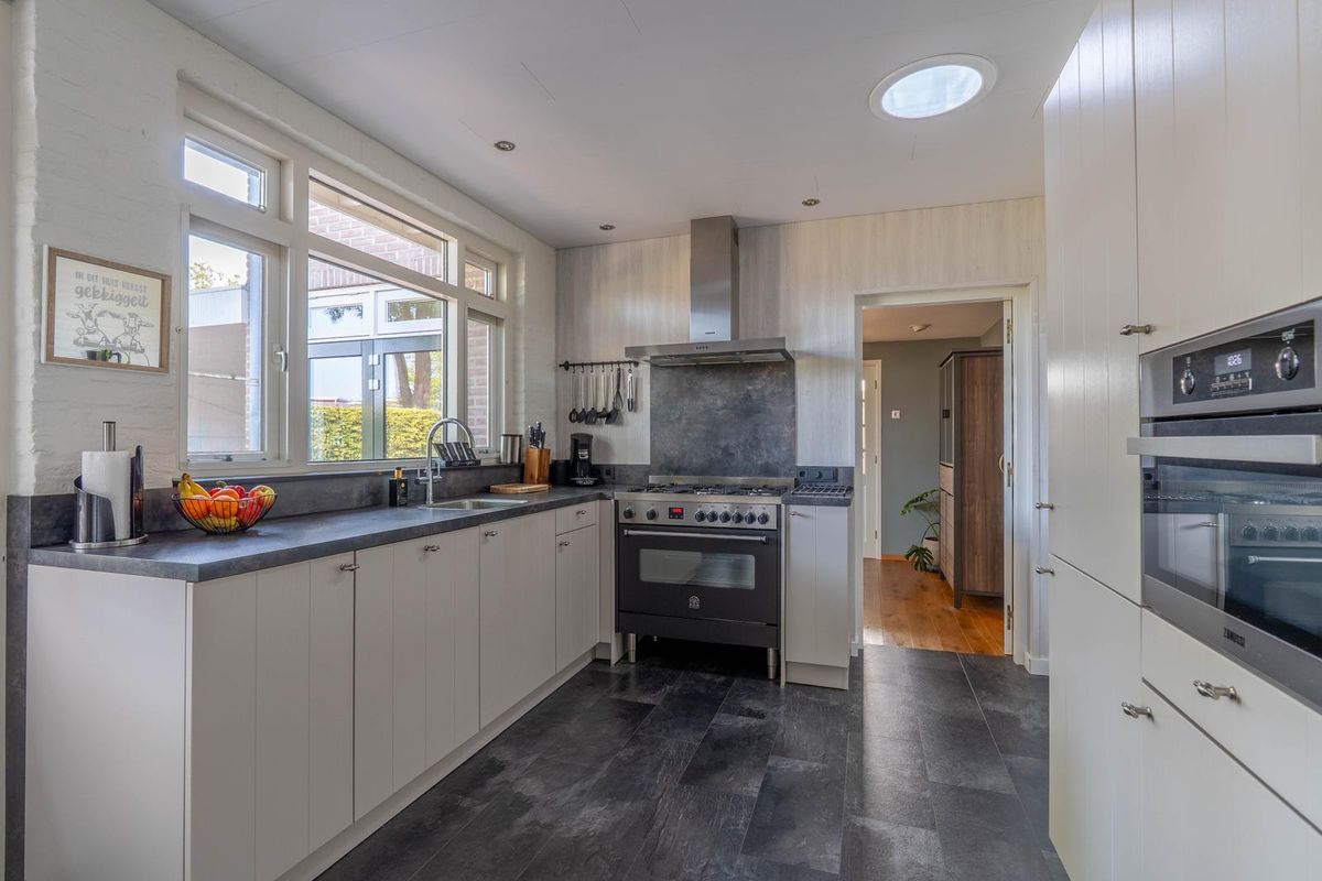 Via de voordeur stap je binnen in de hal met toegang tot de trapopgang, een trapkast en het woongedeelte. De woonkamer ligt aan de voorzijde en kijkt uit op de rustige straat. De eetkamer sluit hier mooi op aan. De keuken is een aparte, ruime ruimte met veel werkblad en opbergruimte. Voor de liefhebber is er een gasfornuis, twee ovens en een vaatwasser aanwezig. Vanuit de keuken loop je door naar de bijkeuken, waar je nog meer kastruimte vindt, plek voor een diepvries en de aansluitingen voor wasmachine en droger. En alsof dat nog niet genoeg is, is er ook nog een multifunctionele extra kamer aan de bijkeuken. Perfect als hobbyruimte, werkplek of speelkamer. Deze ruimte kan eventueel ook worden afgesloten van de woning. Dit kan ook praktische zijn voor je bedrijf aan huis.