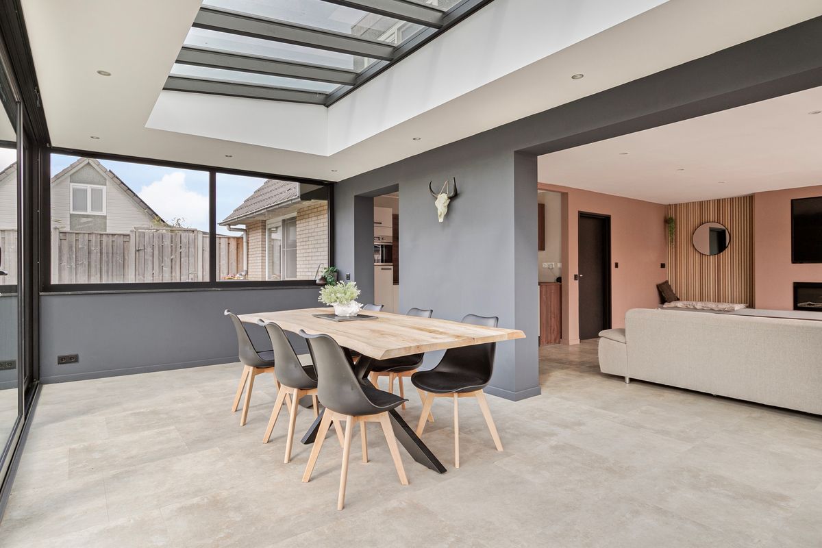 De woonkamer heeft een mooie uitbouw met een lichtstraat dat zorgt voor voldoende daglichttoetreding. Een heerlijke ruimte met een mooi uitzicht over de achtertuin. Deze uitbouw is voorzien van inbouwspots.