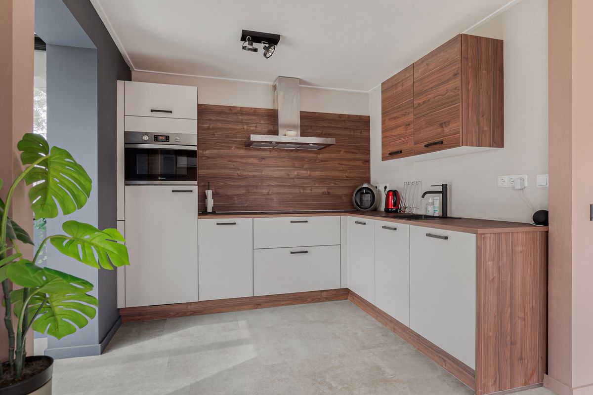 De moderne open keuken heeft een L-opstelling. De inrichting bestaat uit een 4-pits inductie kookplaat, RVS afzuigkap, combi-oven, koelkast en vaatwasmachine.