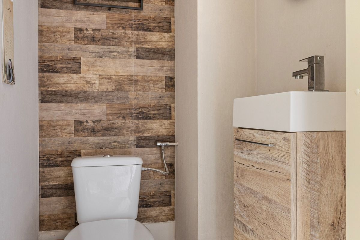 De badkamer is voorzien van een douchecabine en een wastafel met een badkamermeubel. In de badkamer is de aansluiting voor een wasmachine en droger. Deze ruimte is geheel betegeld.