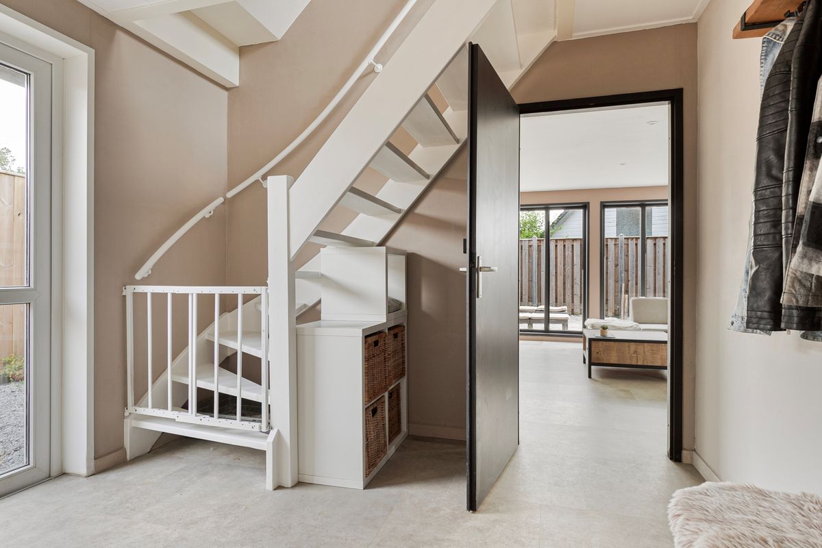 De houten trap in de ontvangsthal geeft toegang tot de 1e verdieping met overloop en 3 slaapkamers.