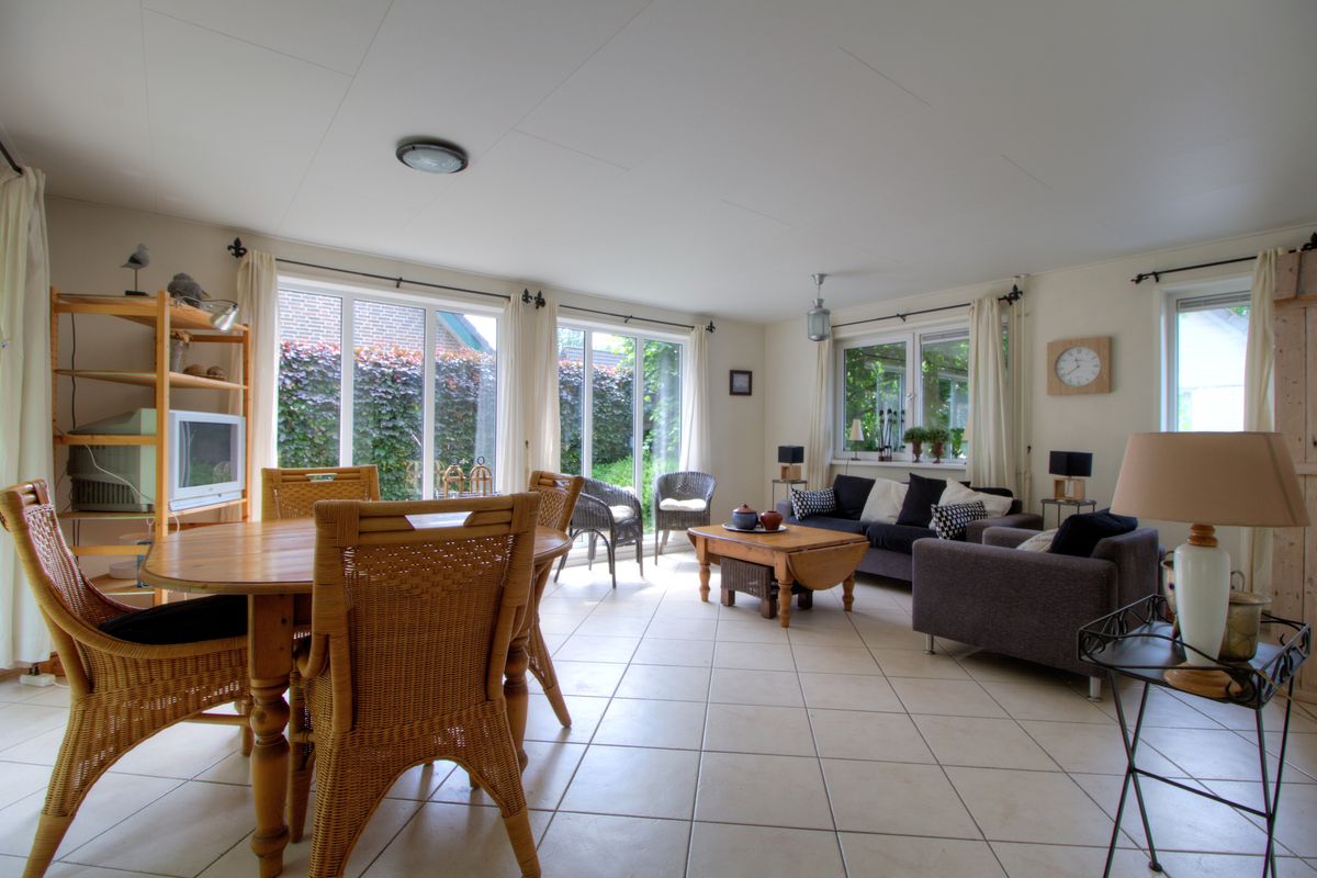 De woonkamer is een lichte ruimte met uitzicht op de tuin en rondom meerdere raampartijen. We schreven het al eerder, de ligging op het perceel en de groene haag rondom maakt het dat je hier veel privacy geniet!