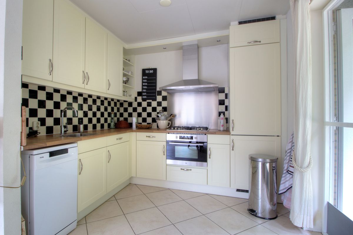 De lichte L-vormige open keuken heeft diverse boven- en onderkasten en is voorzien van een 4-pitskookplaat, roestvrij stalen afzuigkap, combi-oven, koelkast en vaatwasser.