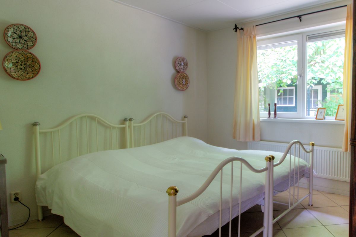 De 1e slaapkamer op de benedenverdieping is rustig gelegen aan de achterzijde van de woning en kijkt uit op de tuin. De slaapkamer heeft een lichte afwerking van de wanden en het plafond. De vloer is voorzien van een tegelvloer.