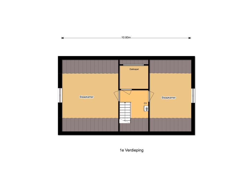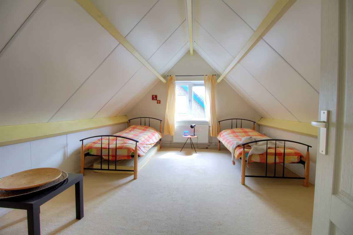 De houten trap in de ontvangsthal geeft toegang tot de 1e verdieping met overloop en 2e en 3e slaapkamer. Beide slaapkamers zijn nagenoeg gelijkwaardige aan elkaar en hebben vloerbedekking, een schuine wandafwerking en een raampartij. Twee fijne kamers, ideaal als slaapkamer maar bijvoorbeeld ook in te richten als hobby- of werkruimte. Tevens is op deze verdieping nog een kleinere kamer.