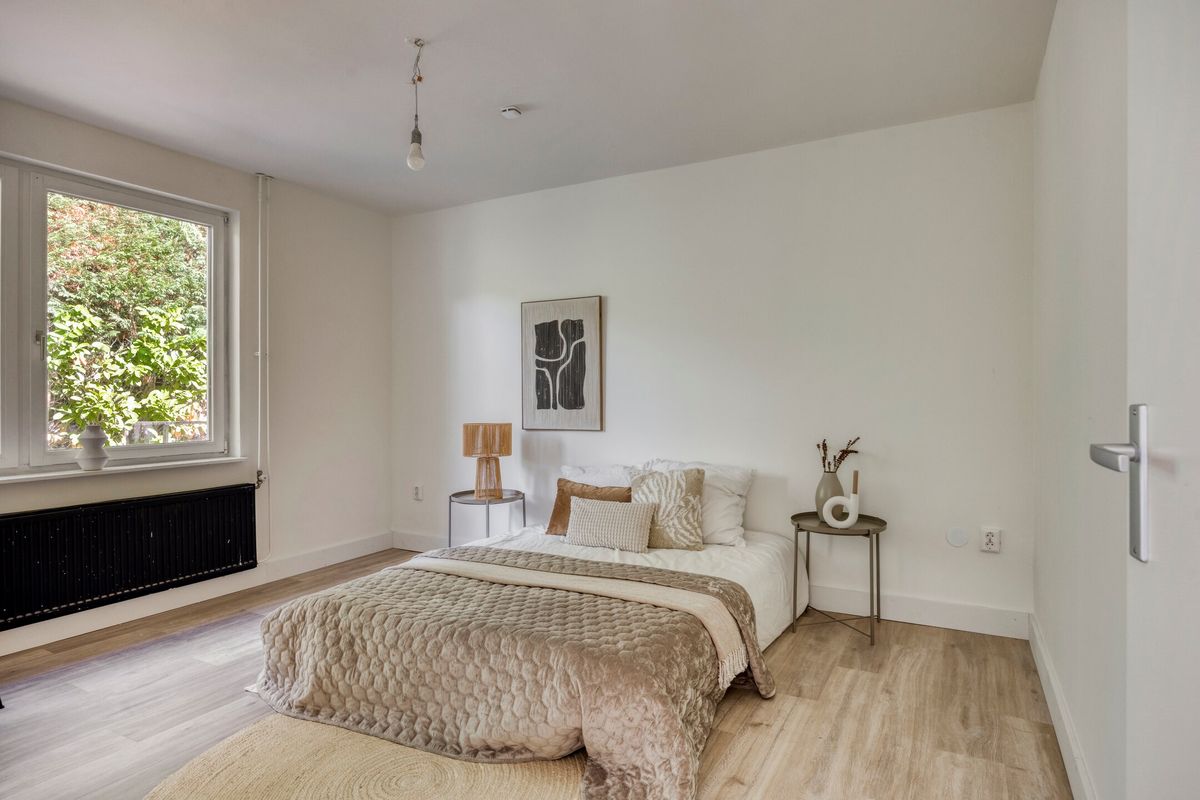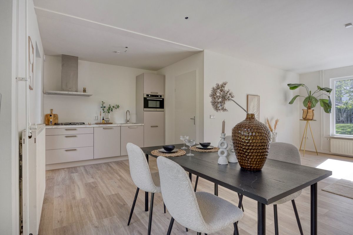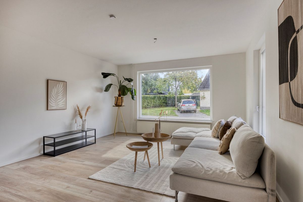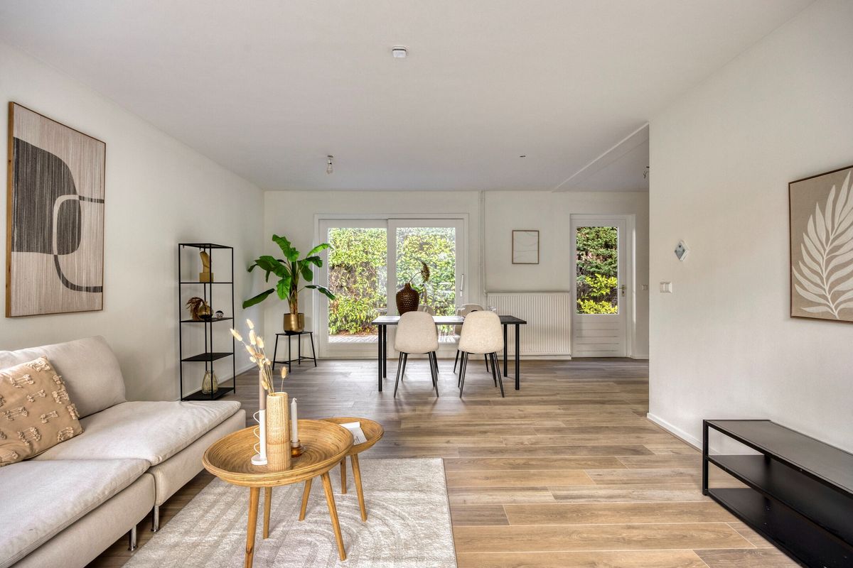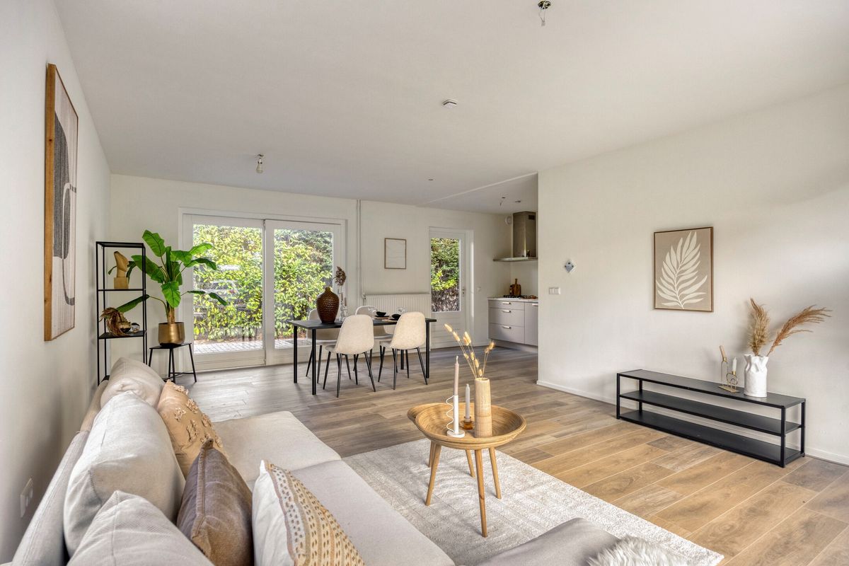 De ruime en lichte woonkamer beschikt over meerdere raampartijen en een schuifpui, wat zorgt voor veel natuurlijk licht. De vloer is afgewerkt met pvc laminaat en de wanden zijn voorzien van strak stucwerk.
