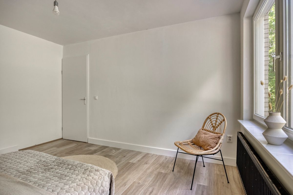 De slaapkamer op de begane grond heeft een pvc laminaatvloer en wanden zijn gestuct. Door de raampartijen geniet deze ruimte van een fijne lichtinval.