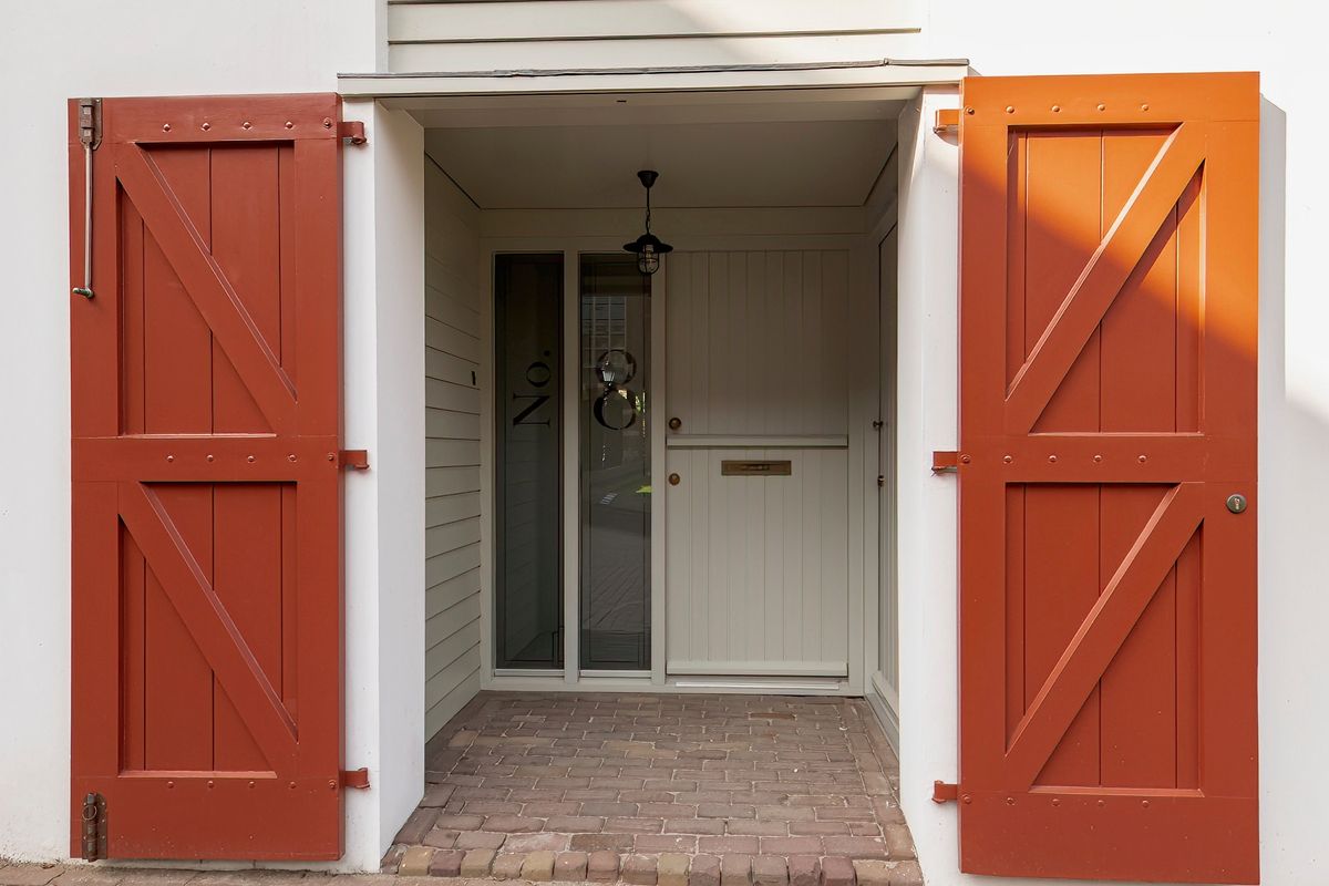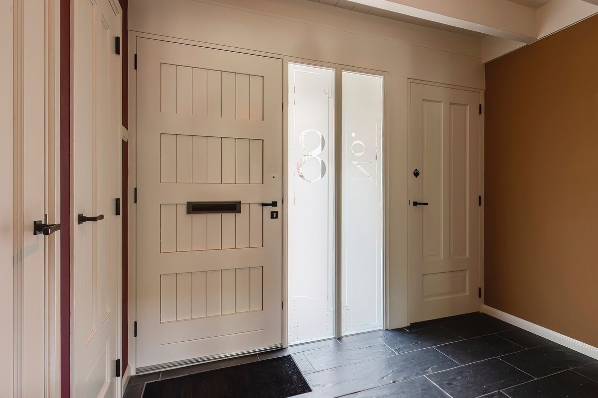 Via het overdekte portiek met charmante houten luiken stap je binnen in de ruime hal met garderobe, modern toilet en toegang tot de bijkeuken/berging met wasmachineaansluiting en een extra deur naar buiten (handig voor de fiets).