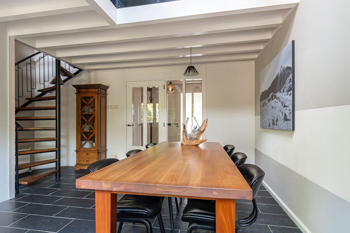 De openslaande deuren geven toegang tot de tuin. De vloer is afgewerkt met donker Portugees leisteen en voorzien van vloerverwarming. Duurzaam en comfortabel.