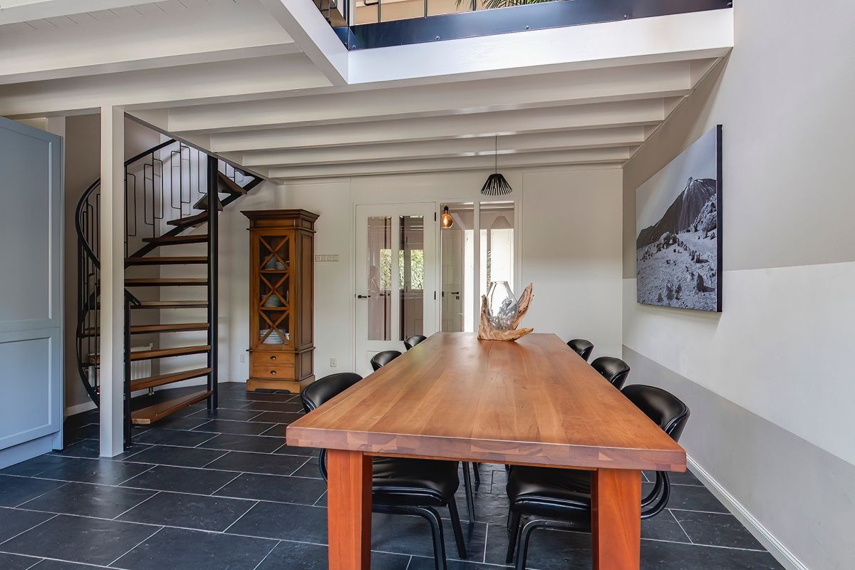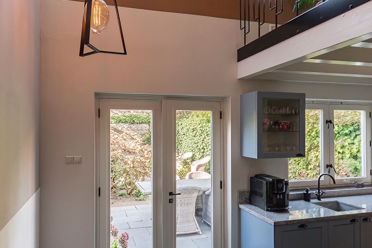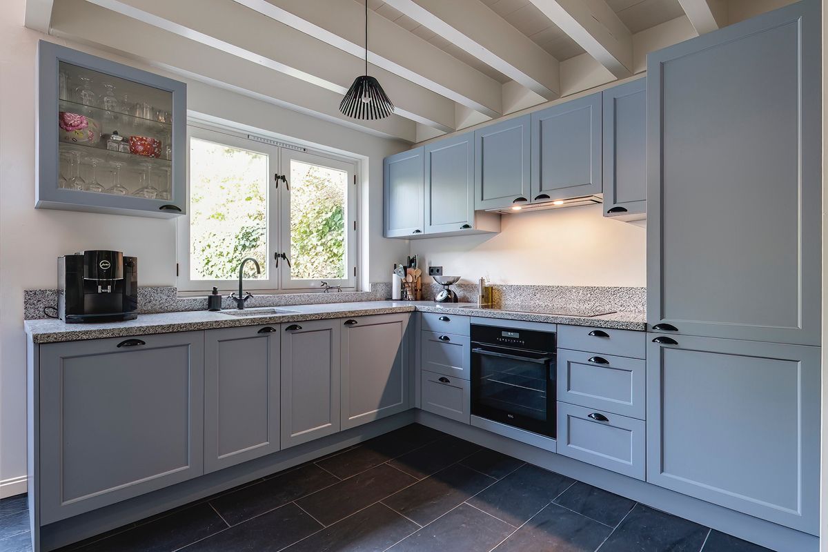 Daarachter ligt de royale woonkeuken, het hart van het huis. De hoogte, de vide en de grote ramen zorgen voor een bijzonder ruimtelijk gevoel. De stijlvolle keuken (2019) in landelijke stijl is voorzien van granieten werkbladen en moderne inbouwapparatuur (oven, inductie kookplaat, afzuigkap, koelkast, vriezer en vaatwasser).