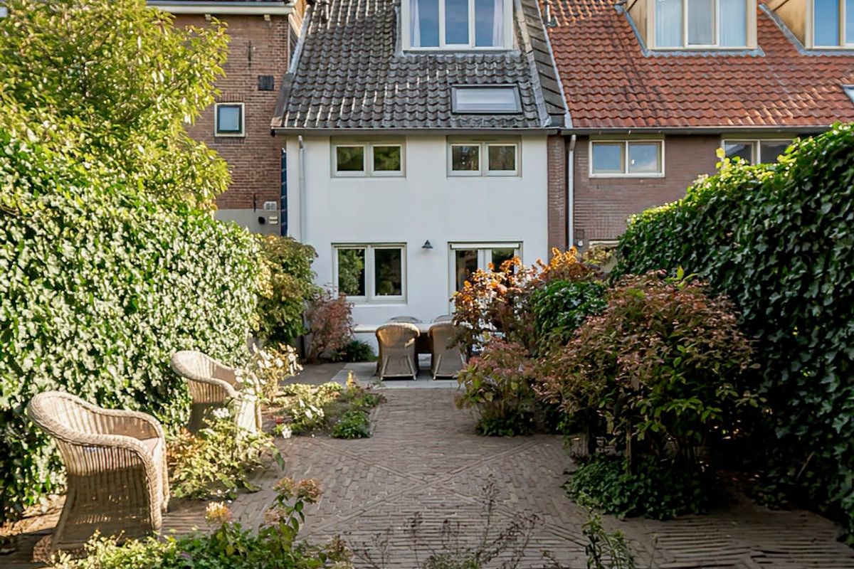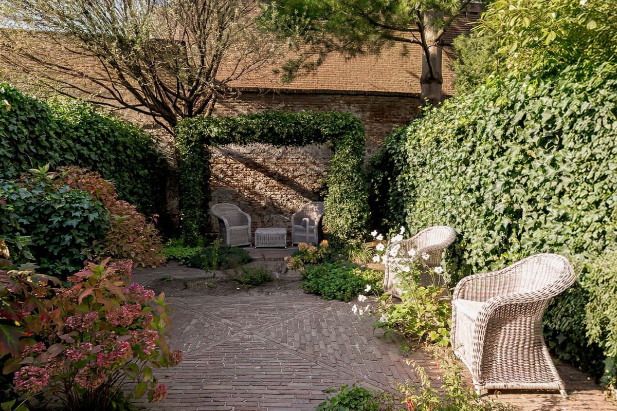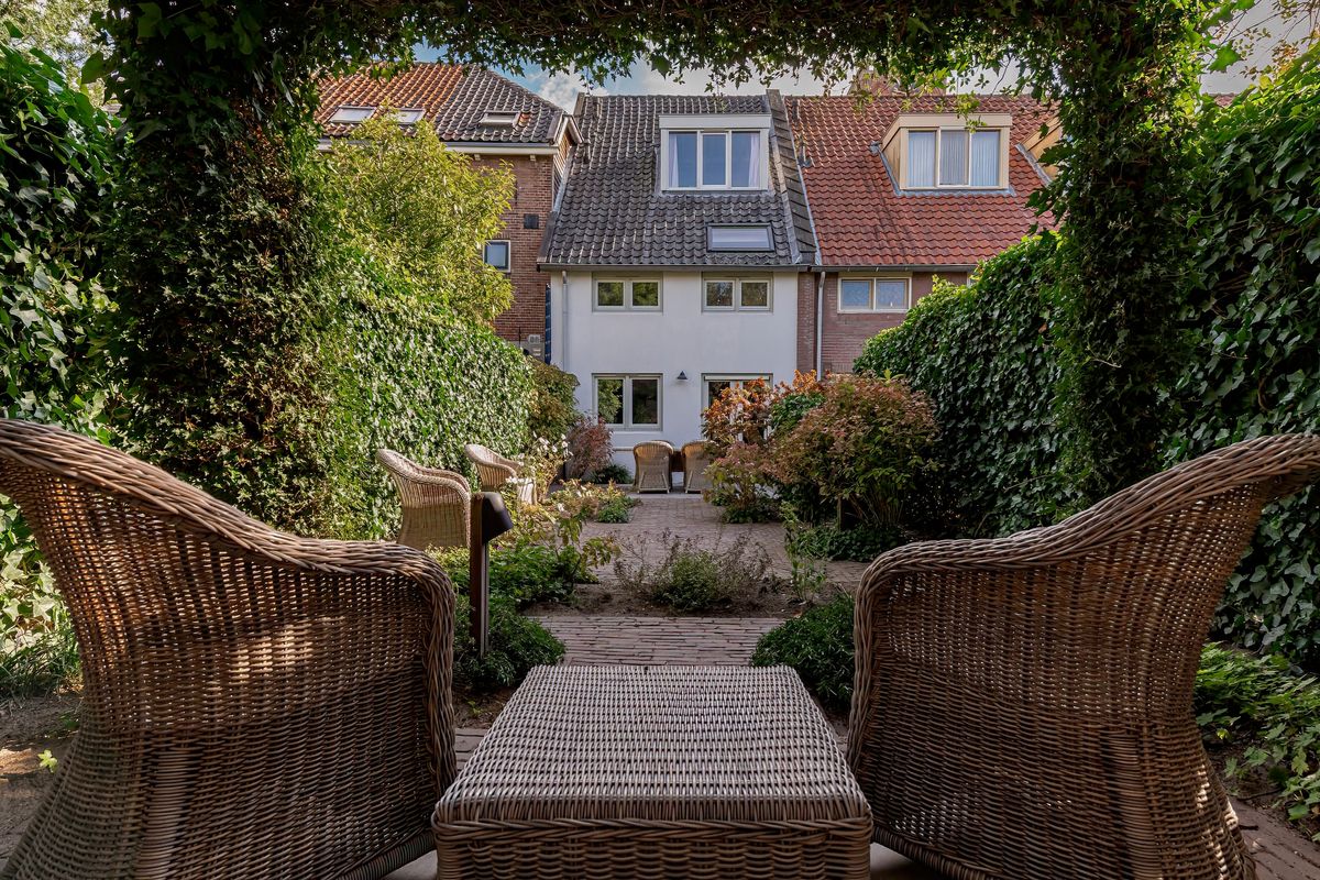 Achter de woning ligt een diepe, stadstuin: een groene oase van rust met volwassen beplanting, een zitje onder een klimop-pergola en volop privacy.