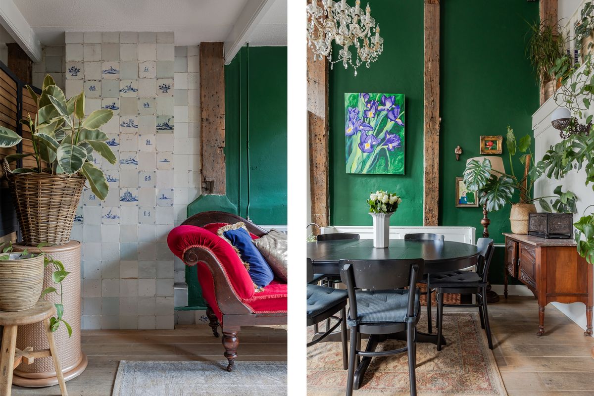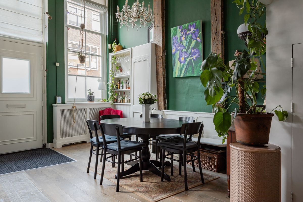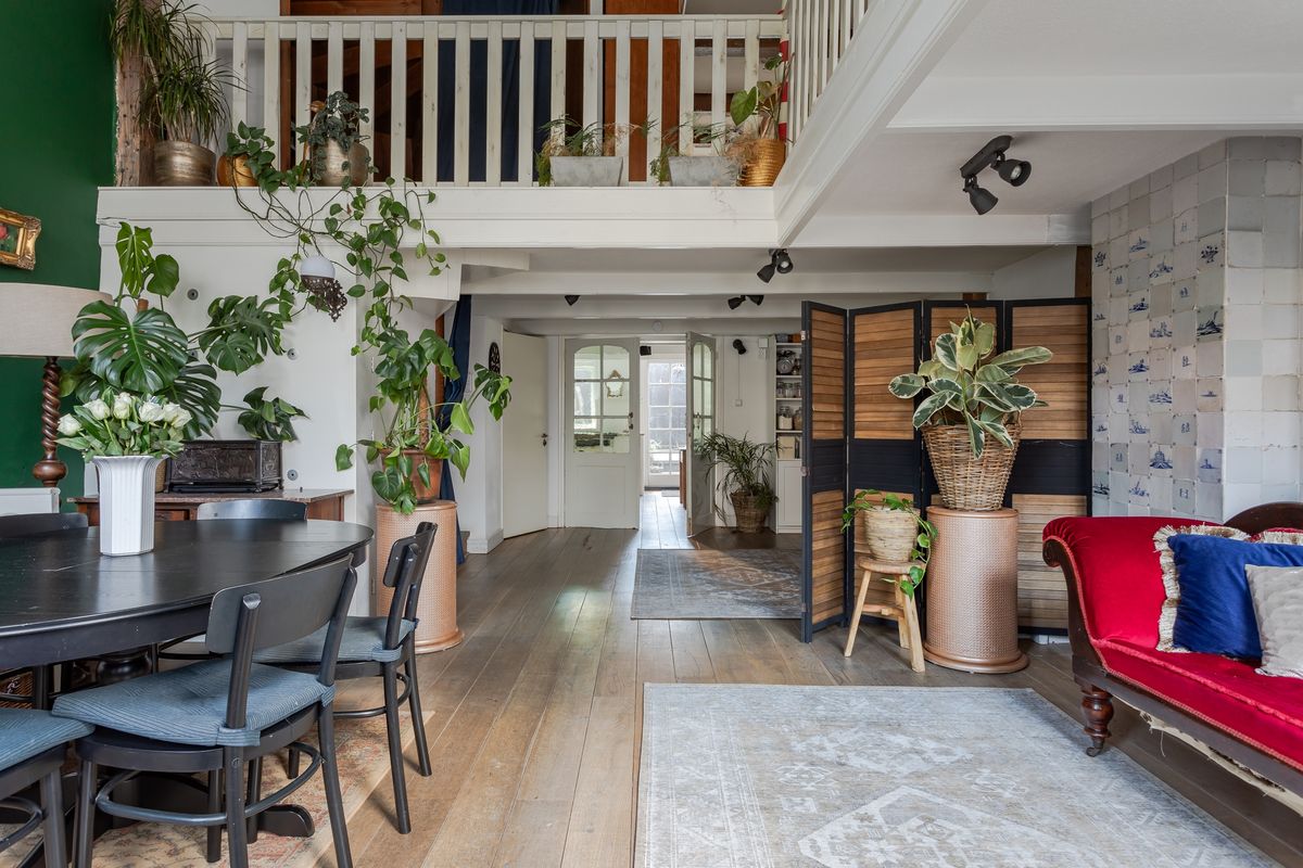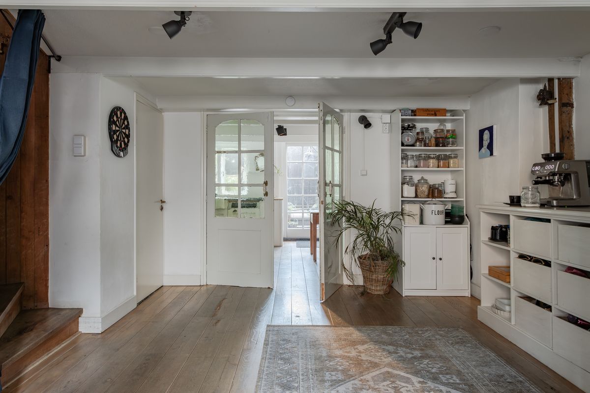De gevel van dit bijzondere pand heeft een snijvoeg en bovenaan pronkt een fraaie klokgevel. Als u door de voordeur stapt wordt u verwelkomt door een prachtige leefruimte met hoog plafond met de vloerbalken in het zicht, alsmede de vide. Hoge roederamen met enkel glas geven veel lichtinval en in de zomer kunnen de elektrisch te bedienen markiezen worden uitgezet. Op de vloer ligt een massief eikenhouten vloer. Om de radiatoren zit een ombouw, vaste hoge kasten sieren de wanden en er zit een oude schouw met antieke tegeltjes die ook als drempels zijn geplaatst. Een lust voor het oog! In het vaste dressoir zit enorm veel bergruimte en en-suite deuren geven toegang tot de gezellige woonkeuken.