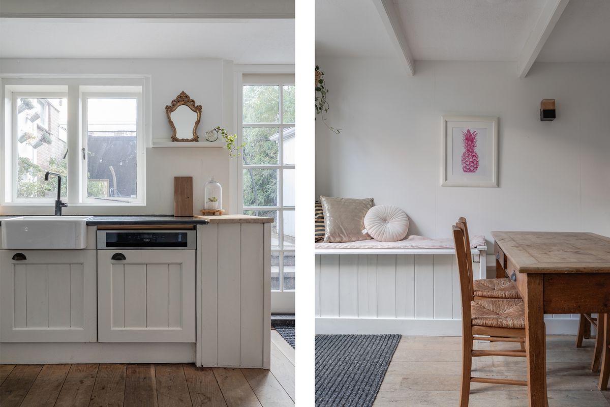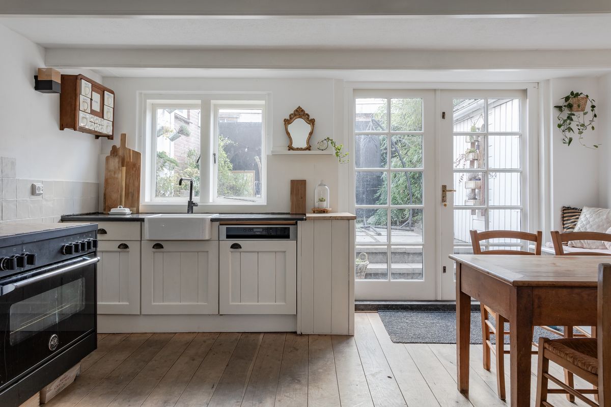 Juist de eenvoud siert deze gezellige woonkeuken waar je bijna verwacht dat Swiebertje en Saartje aan tafel zitten! De massief houten vloer is hier doorgelegd, er is een keukenblok met diep houten werkblad, porseleinen spoelbak, met witjes betegelde wand, de vaatwasser is 2½ jaar oud, de koelkast staat los in een hoek en koken kunt u op het Bertazzoni inductiefornuis met 5 zones en brede oven, ook 2½ jaar oud. Er is een vaste kast voor de wasmachine. Bij de eettafel is een zitplateau over de radiator geplaatst en openslaande deuren met roederamen geven toegang tot de sfeervolle tuin.