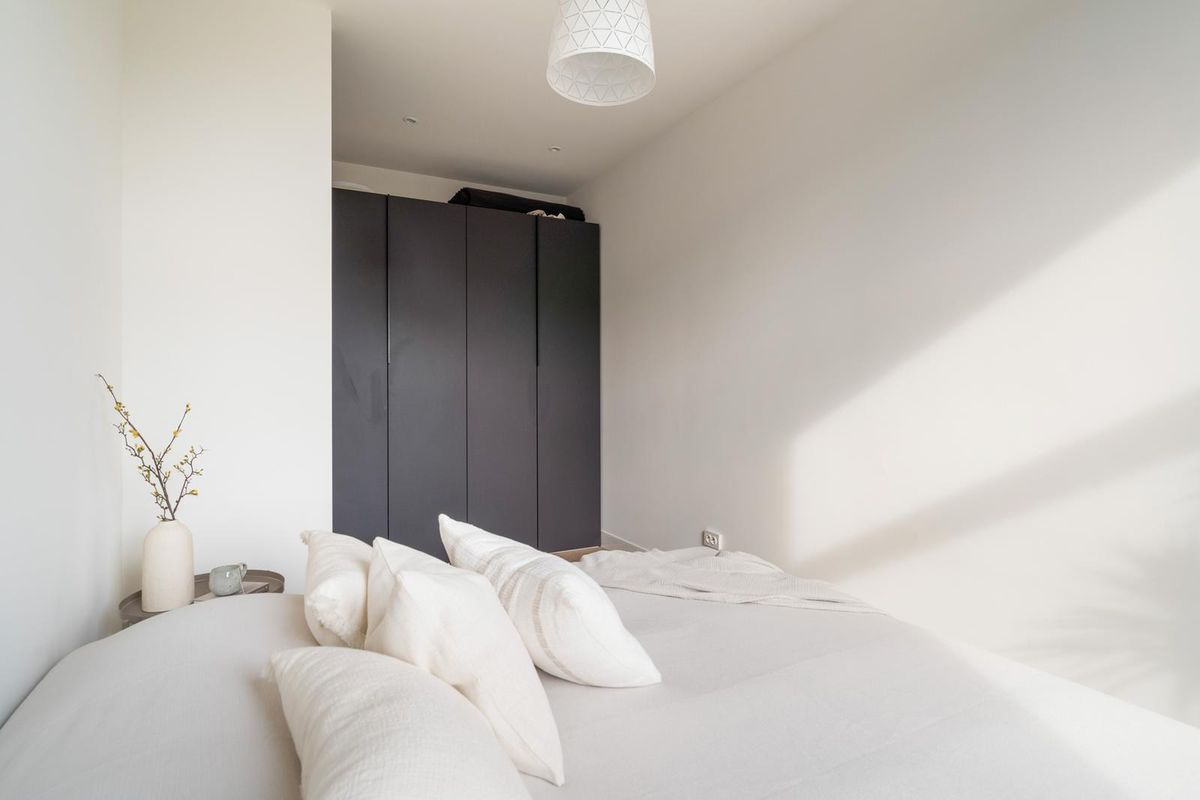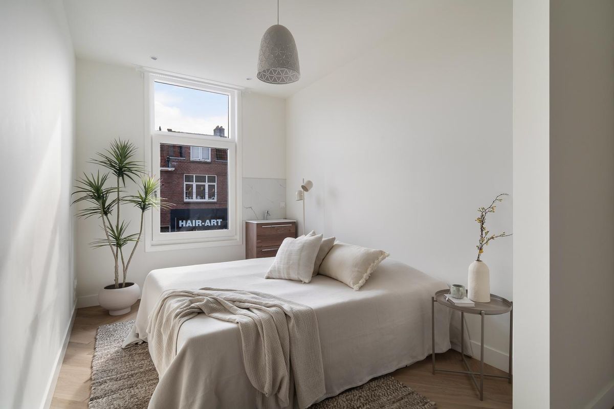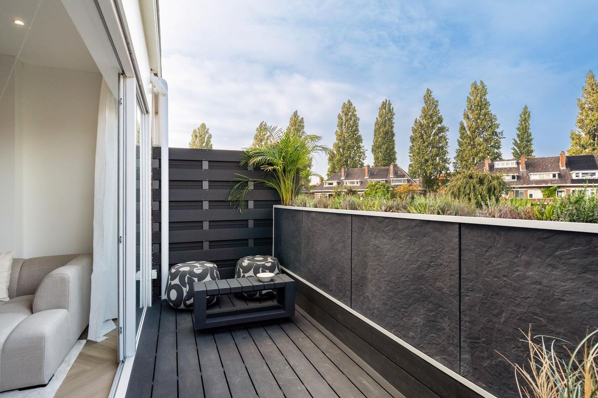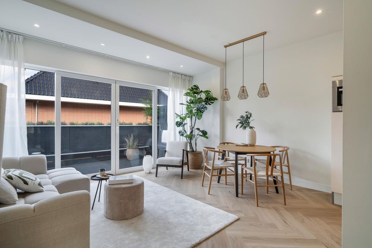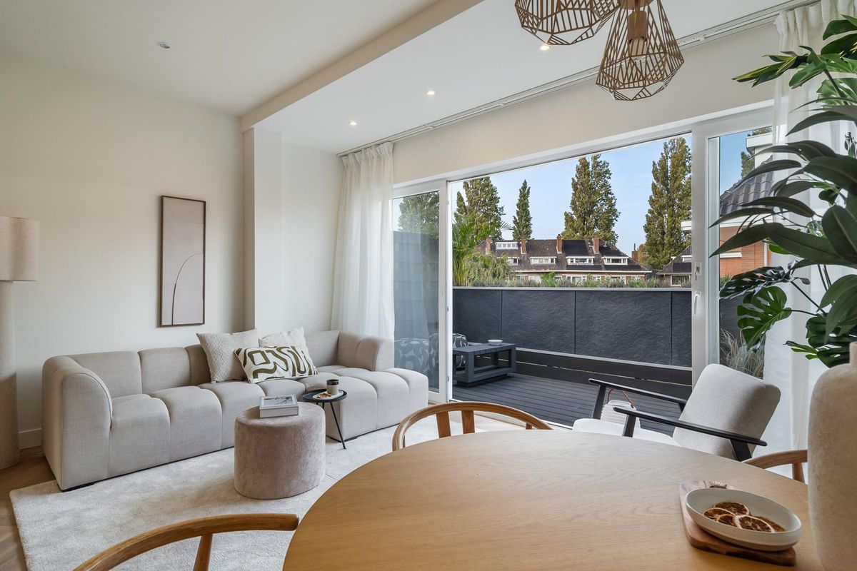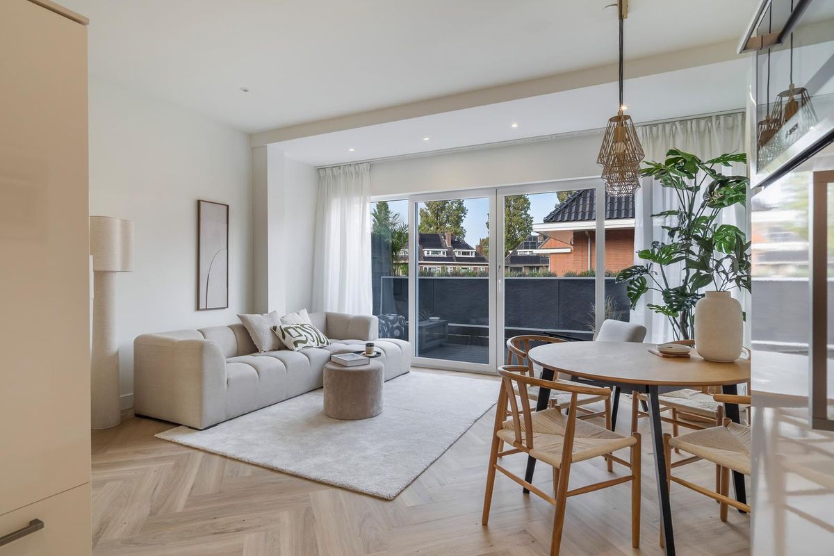 Aan de achterzijde bevindt zich een lichte, royale woonkamer met een grote schuifpui over de volledige breedte, die toegang geeft tot het ruime balkon. De hoge plafonds en strakke afwerking geven de ruimte een extra ruimtelijk gevoel. Er is meer dan genoeg plek voor een comfortabele zithoek en een eettafel.