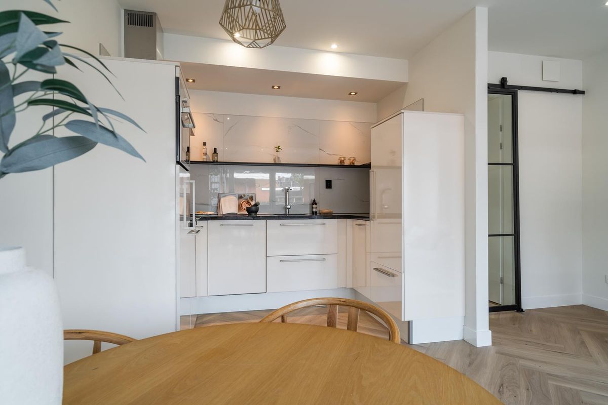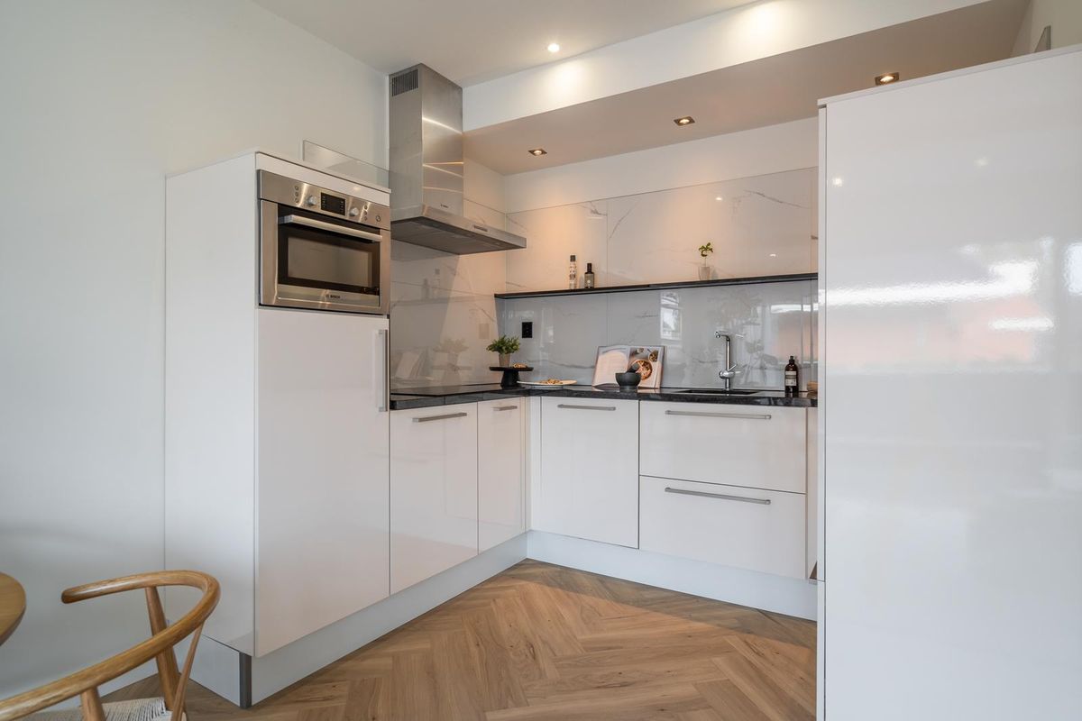 De open keuken ligt centraal in de ruimte en is voorzien van moderne inbouwapparatuur.